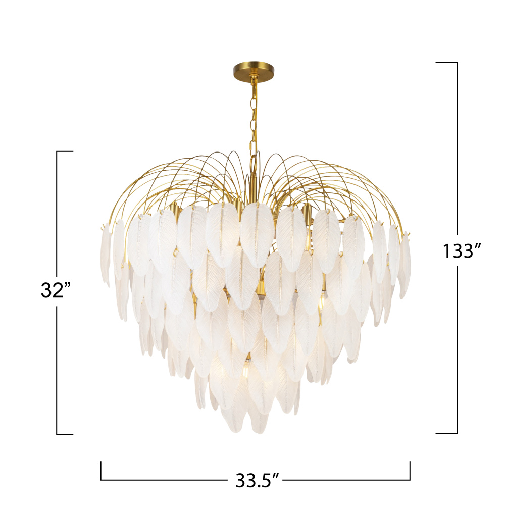 The Alessia collection boasts a captivating design featuring delicate glass leaves suspended from a brilliant airy brass frame. The unique glassware diffuses light casting a mesmerizing and enchanting ambiance in any space. With its harmonious blend of timeless brass elegance and nature-inspired elements, this collection seamlessly combines sophistication and organic beauty, making it a striking centerpiece for any room. The model shown is a 24 light 32" diameter chandelier (Multiple sizes available) (height adjustable via chain)