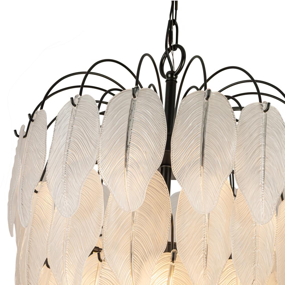 The Alessia Collection foyer chandelier is a captivating blend of modern elegance and nature-inspired artistry. Its bold black frame cradles cascading glass leaves, each etched with organic, lifelike details that evoke a serene forest canopy. With its enchanting glow, this chandelier helps transforms any foyer or staircase area. (57" in length)