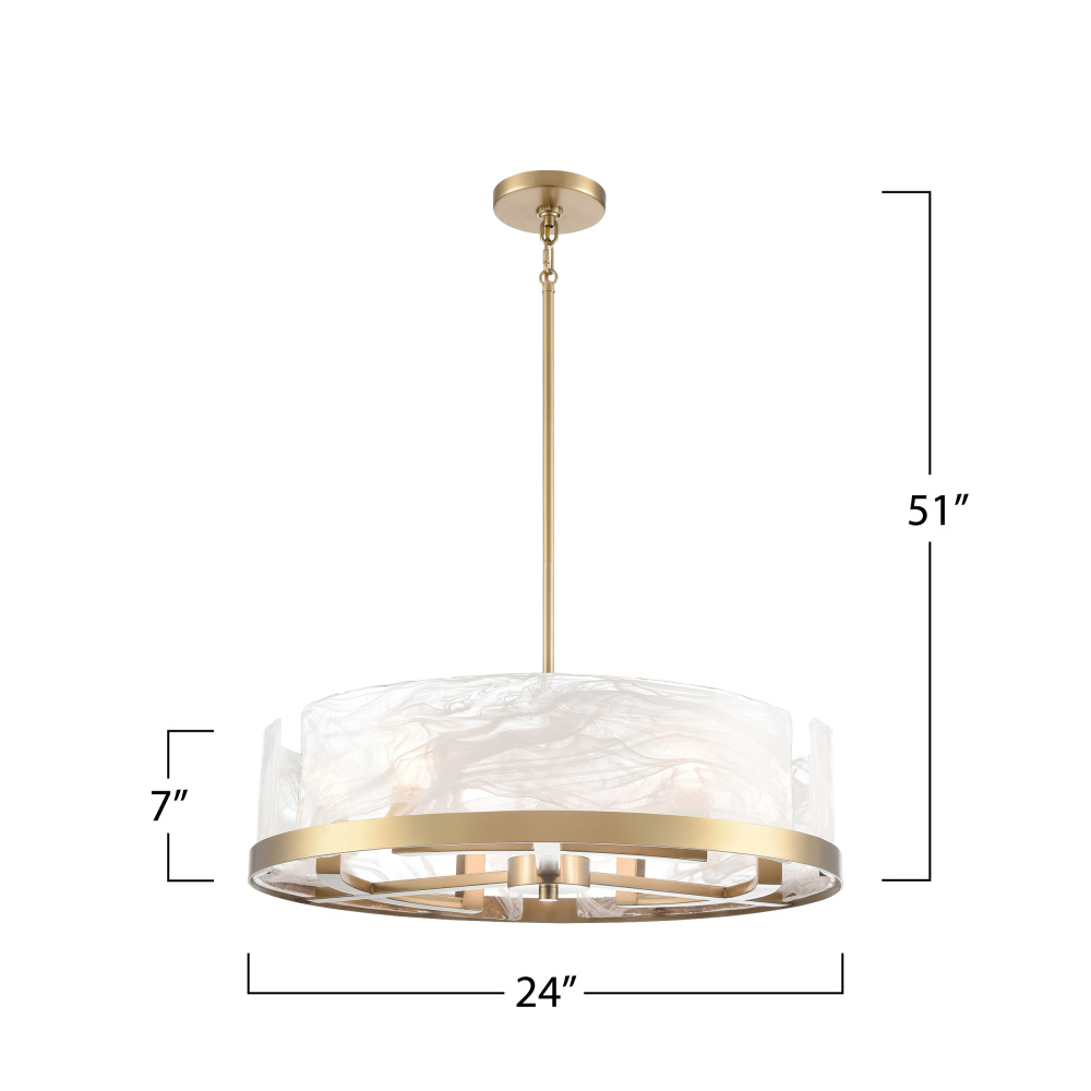 This stunning 6 light round chandelier exudes timeless elegance, blending a brushed brass frame with the ethereal beauty of wispy white Murano-style glass panels. Its cylindrical silhouette radiates sophistication, creating a soft, ambient glow perfect for intimate spaces. The craftsmanship of the Skye collection by designer Kevin Kraemer is evident in the graceful harmony between its materials and design. This piece serves as both a functional light source and a work of art, elevating any room with its luxurious charm. (Comes with extra rods to be hung at the perfect height)