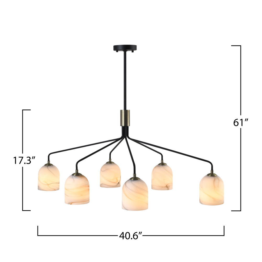 The Crema collection 6 light oval chandelier by Steven Sabados of S&C radiates understated sophistication with its alabaster-style swirl glass, casting a warm, inviting glow. Its sleek black frame is beautifully complemented by brushed brass accents, creating a perfect harmony of modern sophistication and classic charm. Rods included for easy height adjustment to suit different height requirements.