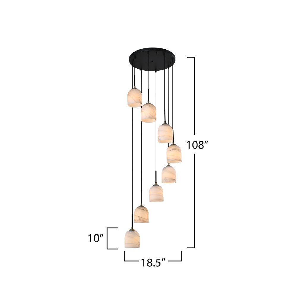 The Crema collection 8 light entry foyer chandelier by Steven Sabados of S&C radiates understated sophistication with its alabaster-style swirl glass, casting a warm, inviting glow. Its sleek black frame is beautifully complemented by brushed brass accents, creating a perfect harmony of modern sophistication and classic charm. Rods included for easy height adjustment to suit different height requirements.