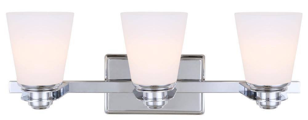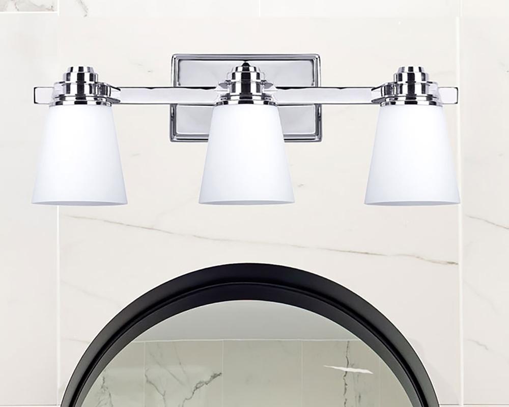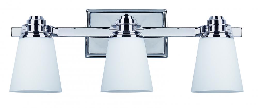 The Chatham 3 Light Vanity, Chrome Finish captures the spirit of art deco flair. A stunning piece that combines Chrome and User Replaceable Bulb to create an unforgettable ambiance.