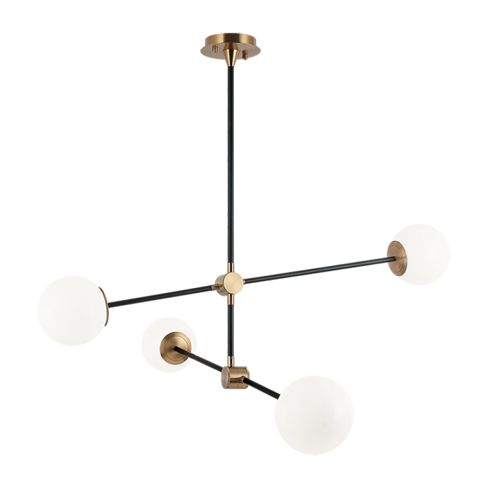 Cosmic is arranged with long, sleek, black rotatable rods, paired with Aged Gold Brass finish details. This collection is available in 3 sizes in either Clear or Opal glass to provide a stunning yet minimalistic look. The creativity of this series adds a unique detail to any space.