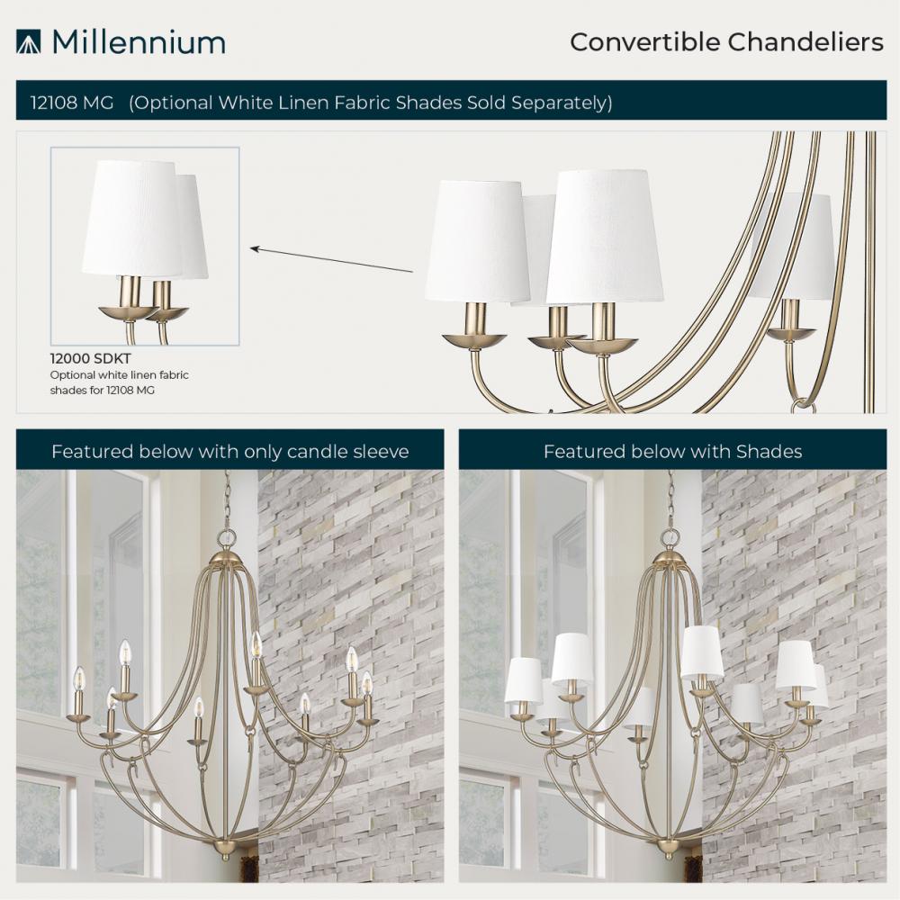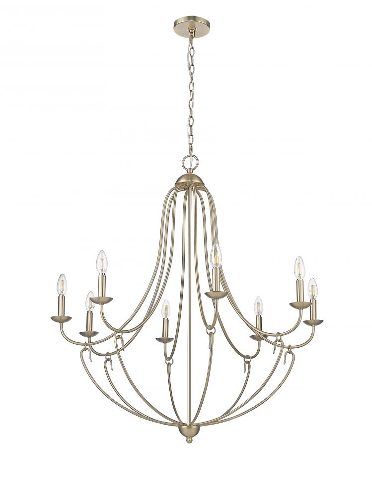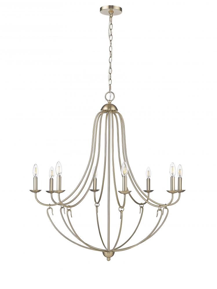 The Eisley Collection of chandeliers is a whimsical and graceful contemporary interpretation of 18th-century lighting design. Modern gold, powder coat black, or polished nickel finish finishes make these fixtures available as 6-light and 8-light options with optional white linen shades. The interlocking hook design of the curved arms adds extra dimension to the overall design.
