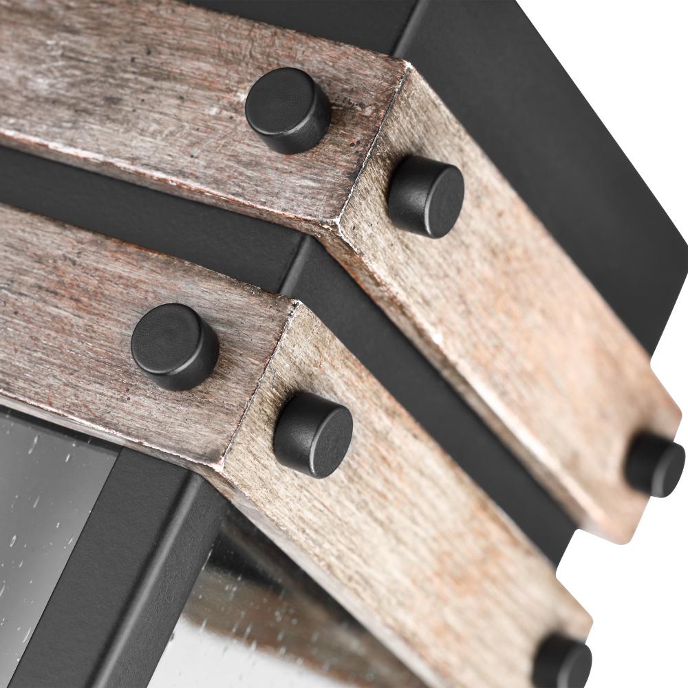 The Homestead small outdoor wall lantern brings together old and new in a fresh way. The knob fasteners, metal cage, and backplate are finished in matte black, surrounding the clear seeded glass. Wood-finished bands add visual interest, and when paired wit