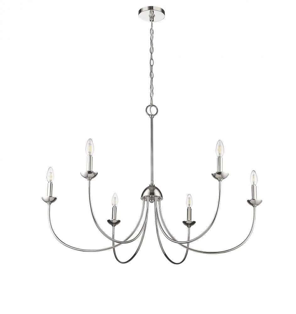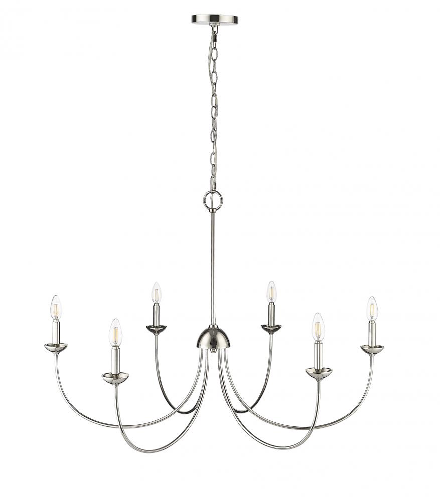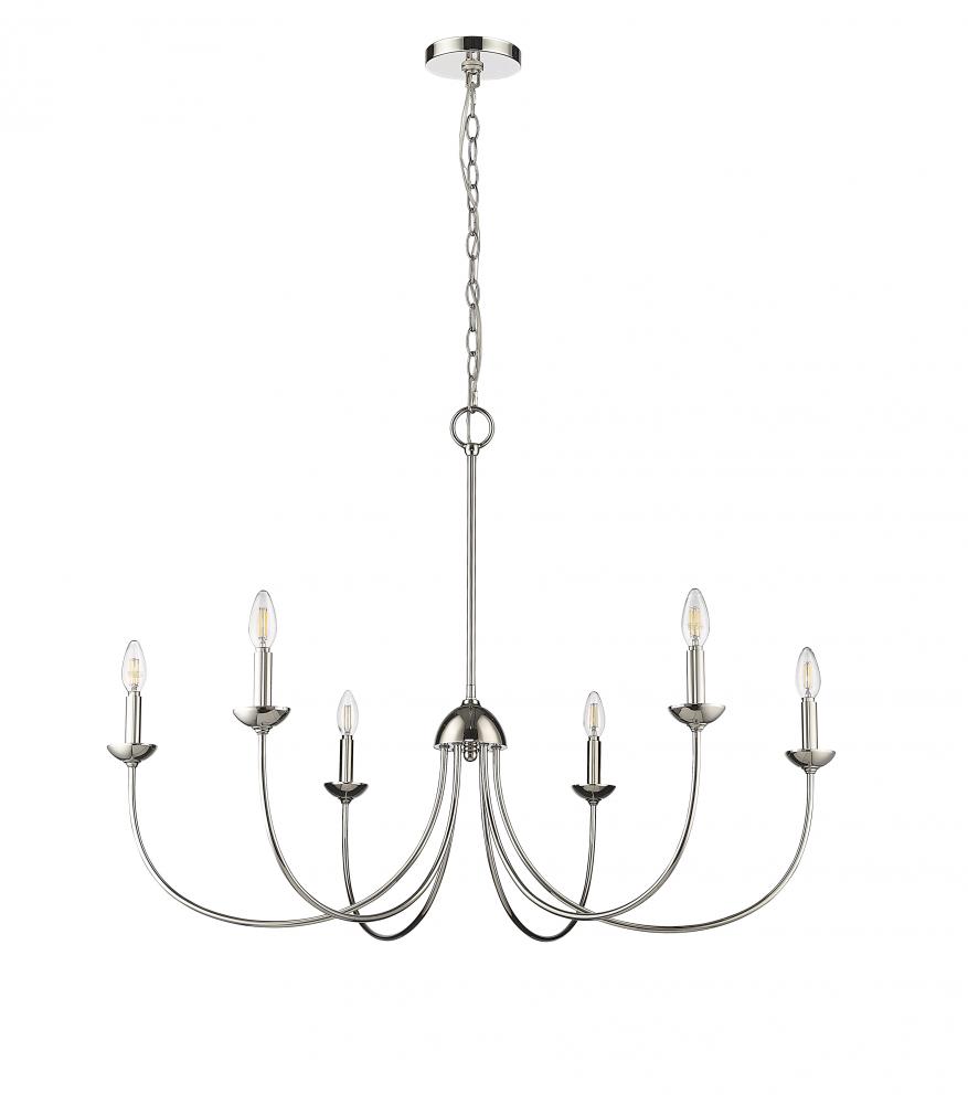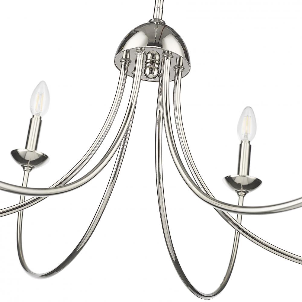 Timeless design at its finest, the Huxley Collection of chandeliers nods to early American style and makes a bold lighting statement for large spaces. Graceful arms arc upward in an antique-inspired flow and are capped with matching candle covers for a clean and dignified look. These fixtures are finished in either matte black or polished nickel with 6-light and 8-light options.