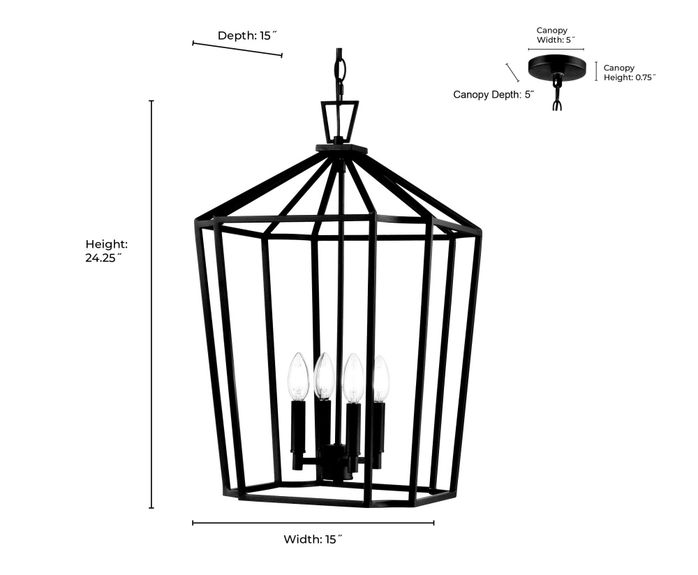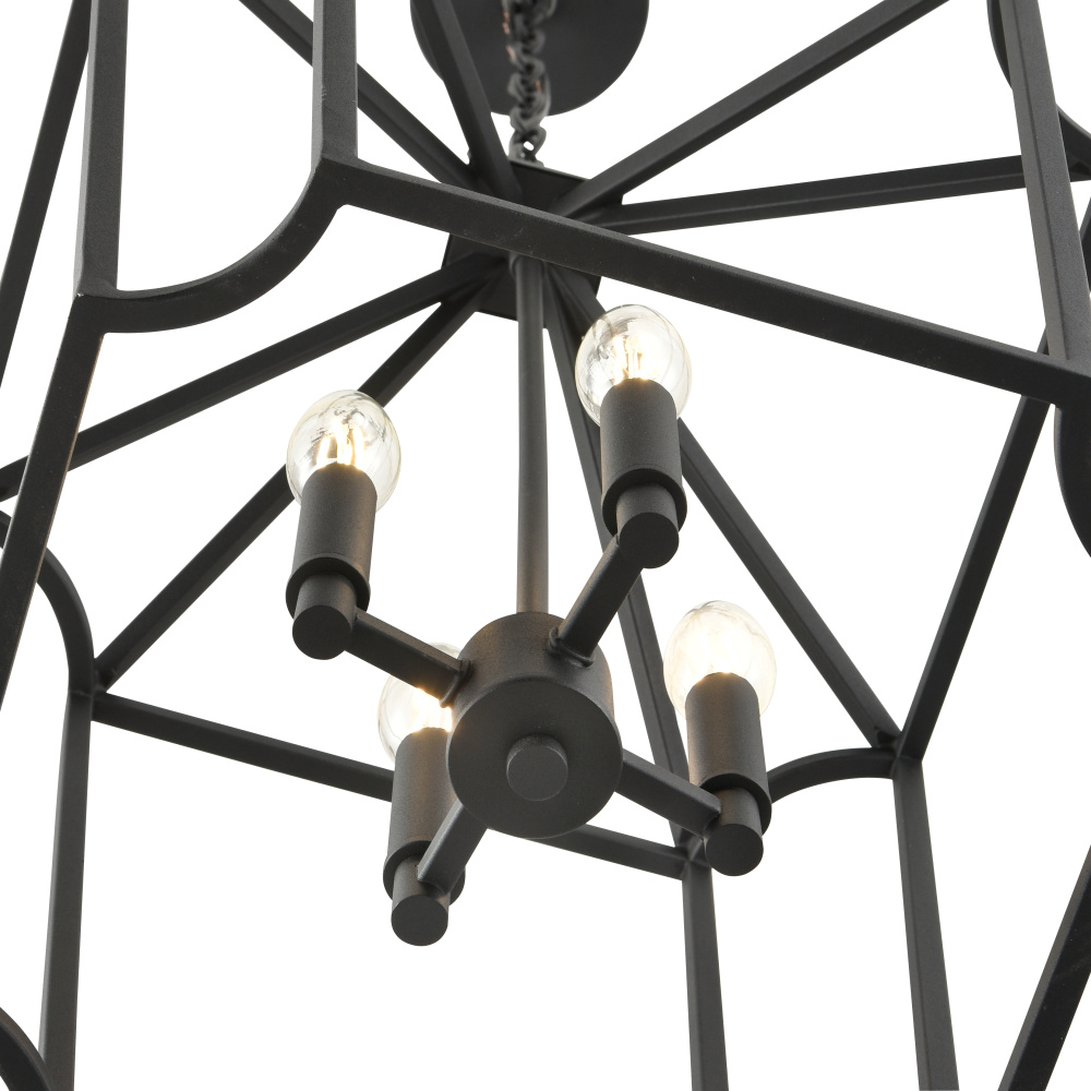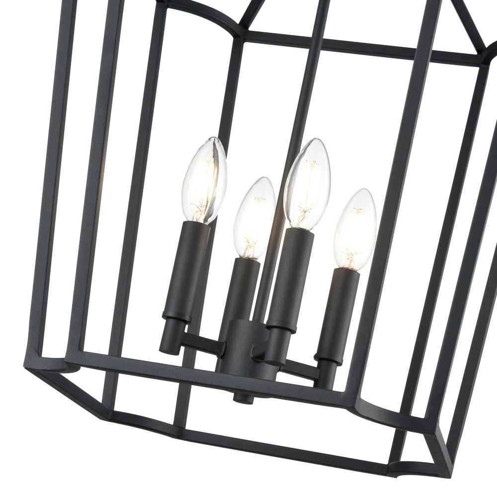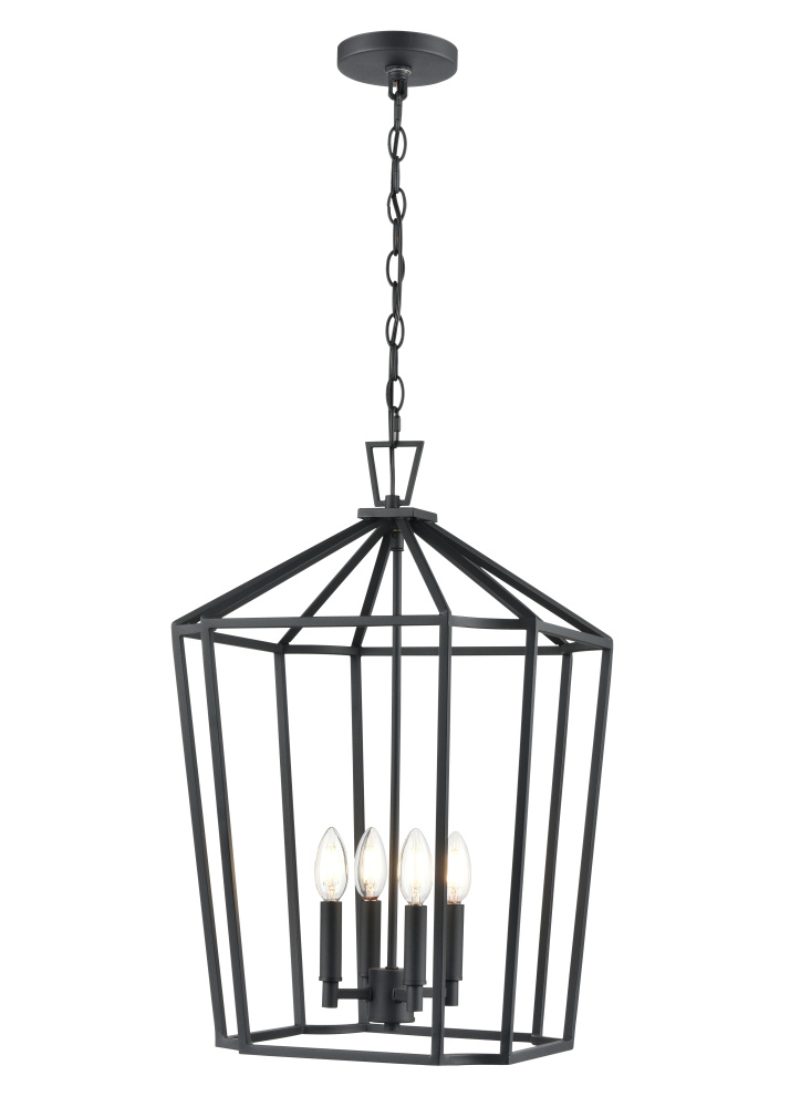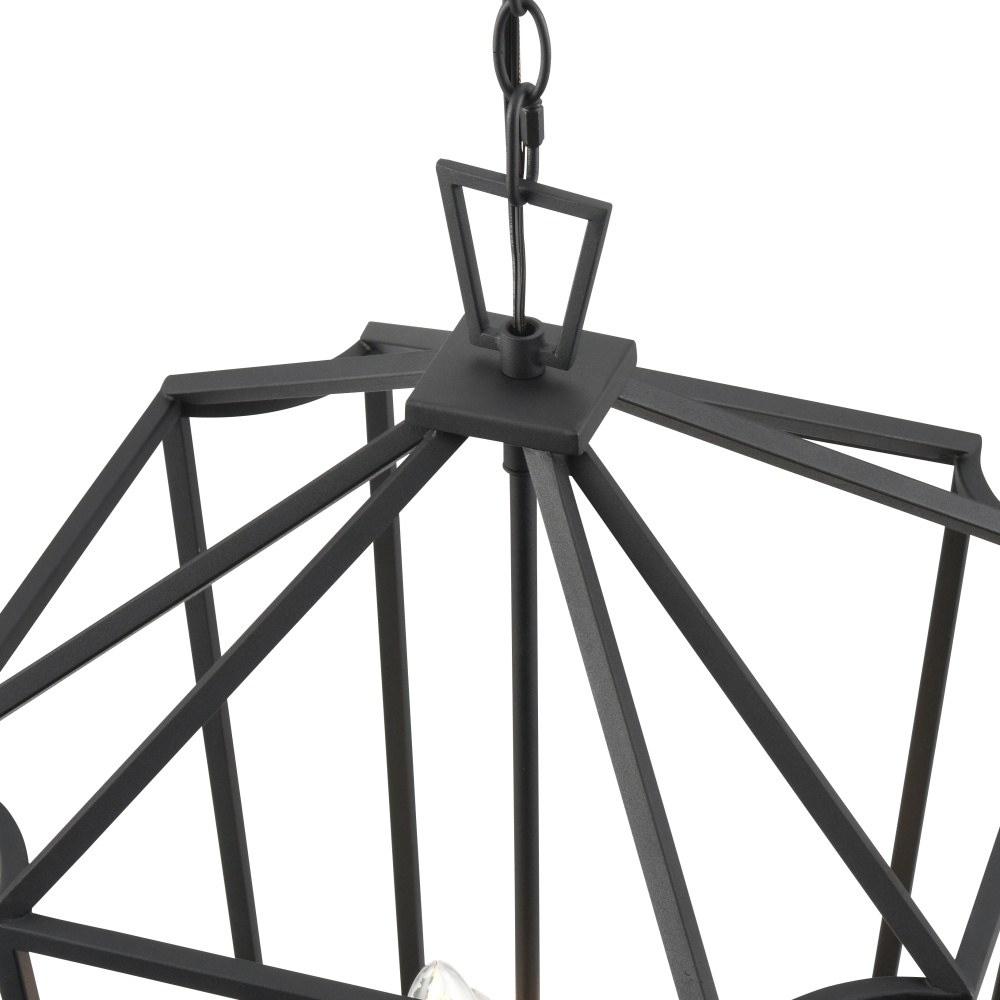 Geometric angles and an open metal framework, reminiscent of the classic lantern form, strike the perfect balance of modern and traditional styling in the Hylena Family of chandelier lighting. With offset corners and triangular top loop, the grand frame surrounds a cluster of candle-style lamps perfectly positioned for a distinctive lighting experience. Finished in matte black and available as 4- or 6-light candelabras, these fixtures create a sophisticated focal point for an entryway, kitchen island, or dining space.