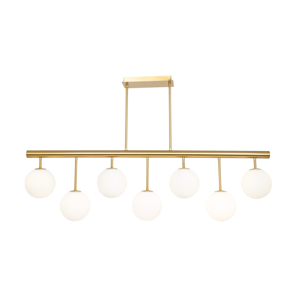The Aurelia Collection is defined by its contemporary allure, featuring a warm brushed brass frame. Each arm of the chandelier is adorned with beautiful spherical white glassware, creating a visually striking contrast and emitting a soft, inviting illumination. This collection seamlessly marries sleek design with a warm aesthetic, making it a stylish and captivating addition to any space. 7 light linear island chandelier shown. (height adjustable via extra rods included)