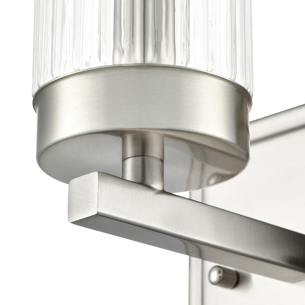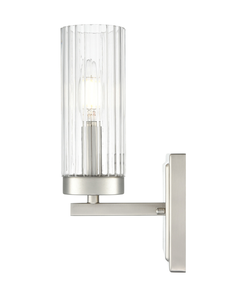 The Iversen Family of vanity and sconce lighting is distinguished by a blend of sleek lines accentuated with post-industrial style hardware. From the square backplate with inset design, to the sparkling clear reeded glass shades, the result is a dazzling play of light perfect for bath or hallway. These exceptional fixtures are available as 1-light sconces and 2-, 3-, or 4-light vanity lamps and are finished in brushed nickel, chrome, matte black, or vintage brass.