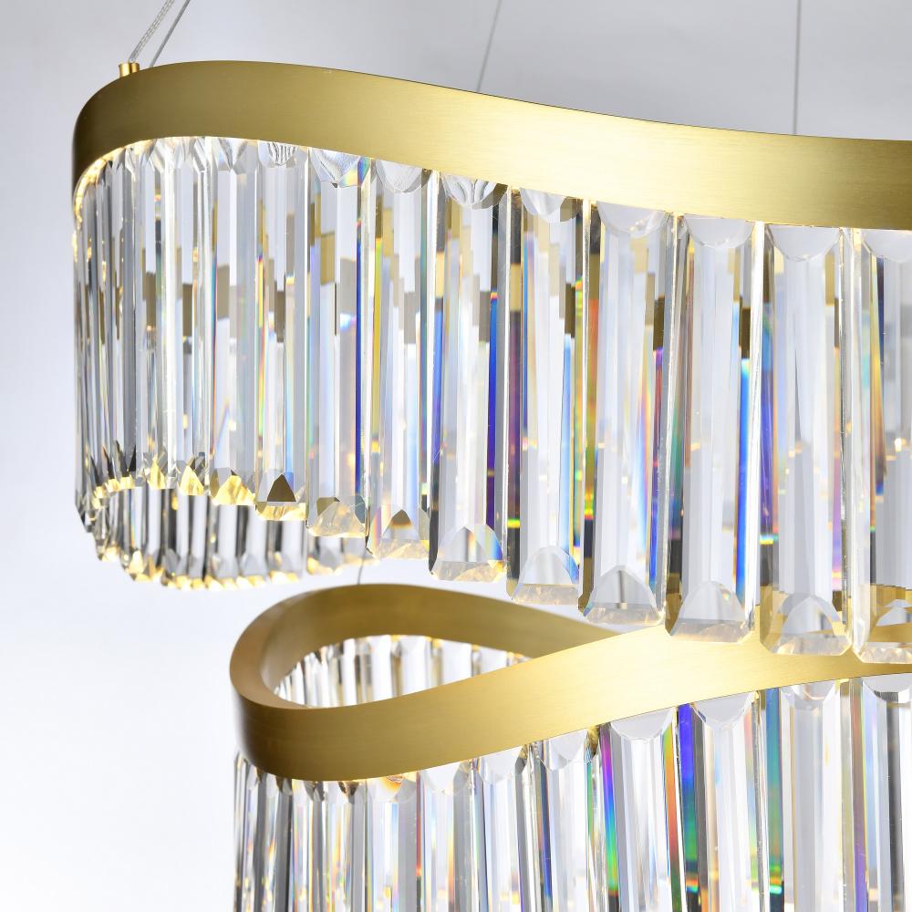 From the Jules collection by Kevin Kraemer, this two tier chandelier is a stunning symphony of light and elegance. Its multi-faceted crystal edges sparkle with mesmerizing light refraction, bringing brilliance to any space. The frame, crafted from luxurious brass, complements its opulent design, while the convenient “push-pin” system and aircraft-style cables allow for effortless height adjustments. Complete with a 3CCT switch, you can tailor the ambiance by choosing from warm, neutral, or cool color temperatures (3K, 4K, 5K).
