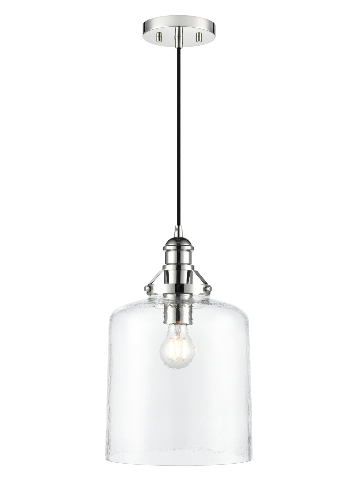 The Khrisa Family of pendant lighting combines modern styling with distinctive shades to create a lighting masterpiece perfect for the kitchen, dining area, or entryway. The stylized 1-light fixtures, finished in brushed nickel, polished nickel, vintage brass, or matte black, feature post-industrial styled hardware, creating a contemporary profile. The gorgeous, hammered glass shades are available in either a drum or bell-shaped silhouette and create a unique dappled lighting effect.