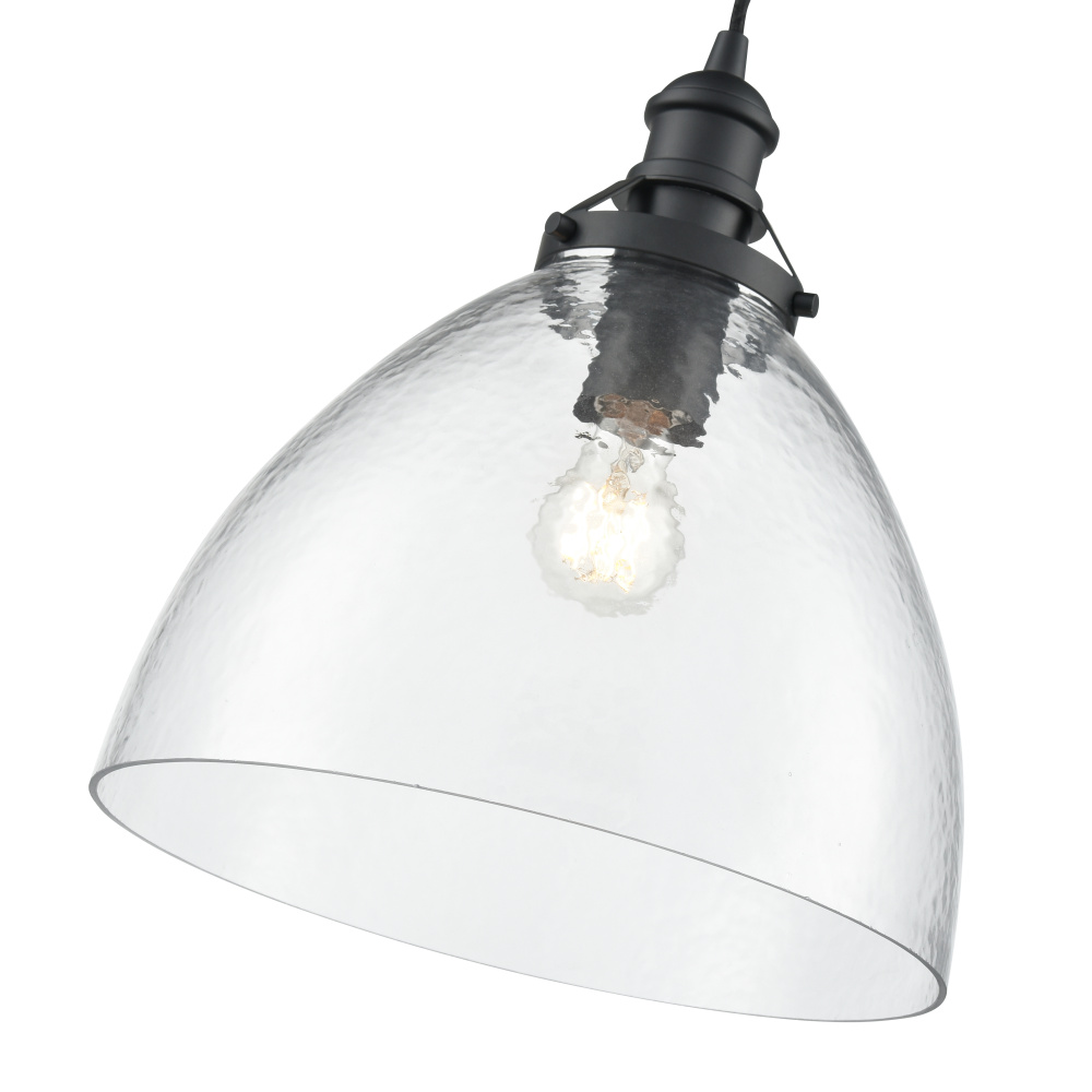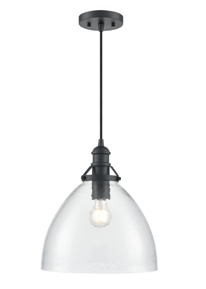 The Khrisa Family of pendant lighting combines modern styling with distinctive shades to create a lighting masterpiece perfect for the kitchen, dining area, or entryway. The stylized 1-light fixtures, finished in brushed nickel, polished nickel, vintage brass, or matte black, feature post-industrial styled hardware, creating a contemporary profile. The gorgeous, hammered glass shades are available in either a drum or bell-shaped silhouette and create a unique dappled lighting effect.