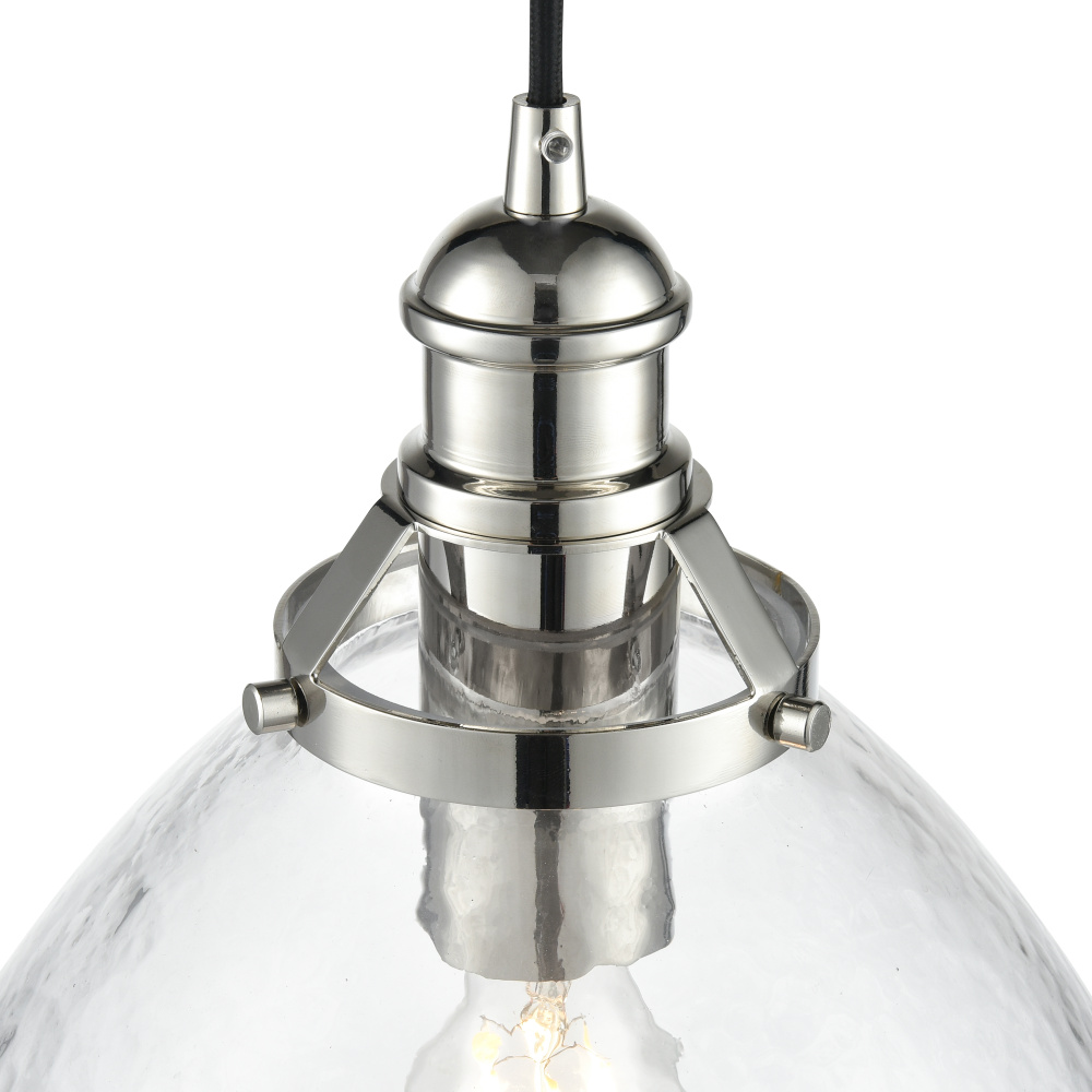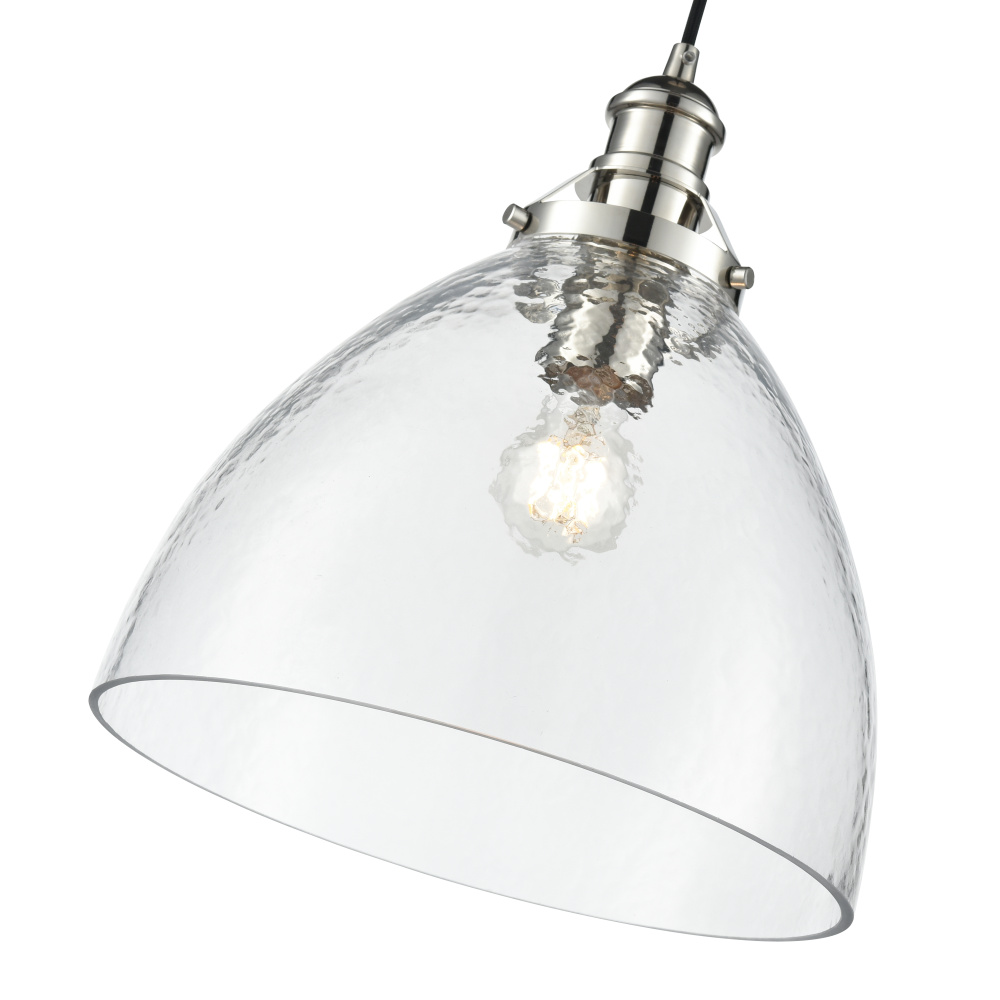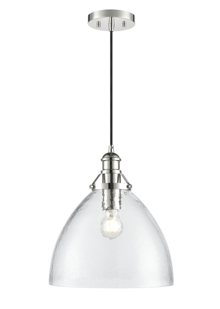 The Khrisa Family of pendant lighting combines modern styling with distinctive shades to create a lighting masterpiece perfect for the kitchen, dining area, or entryway. The stylized 1-light fixtures, finished in brushed nickel, polished nickel, vintage brass, or matte black, feature post-industrial styled hardware, creating a contemporary profile. The gorgeous, hammered glass shades are available in either a drum or bell-shaped silhouette and create a unique dappled lighting effect.