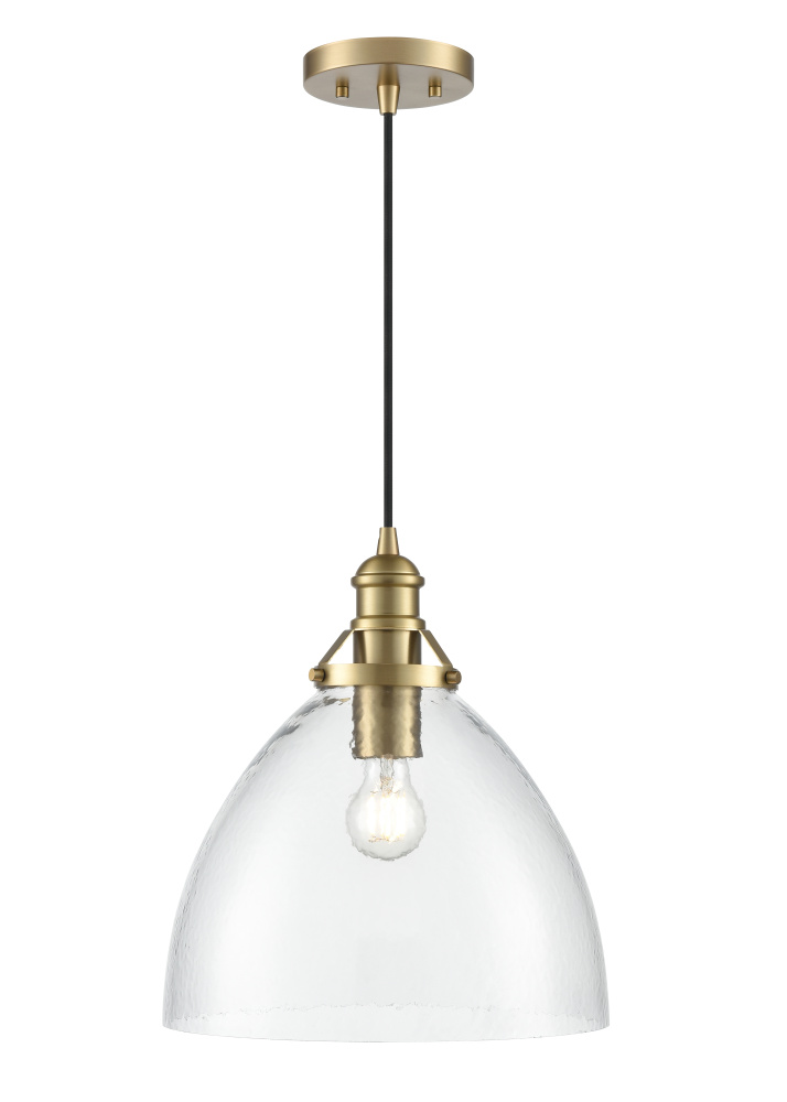 The Khrisa Family of pendant lighting combines modern styling with distinctive shades to create a lighting masterpiece perfect for the kitchen, dining area, or entryway. The stylized 1-light fixtures, finished in brushed nickel, polished nickel, vintage brass, or matte black, feature post-industrial styled hardware, creating a contemporary profile. The gorgeous, hammered glass shades are available in either a drum or bell-shaped silhouette and create a unique dappled lighting effect.