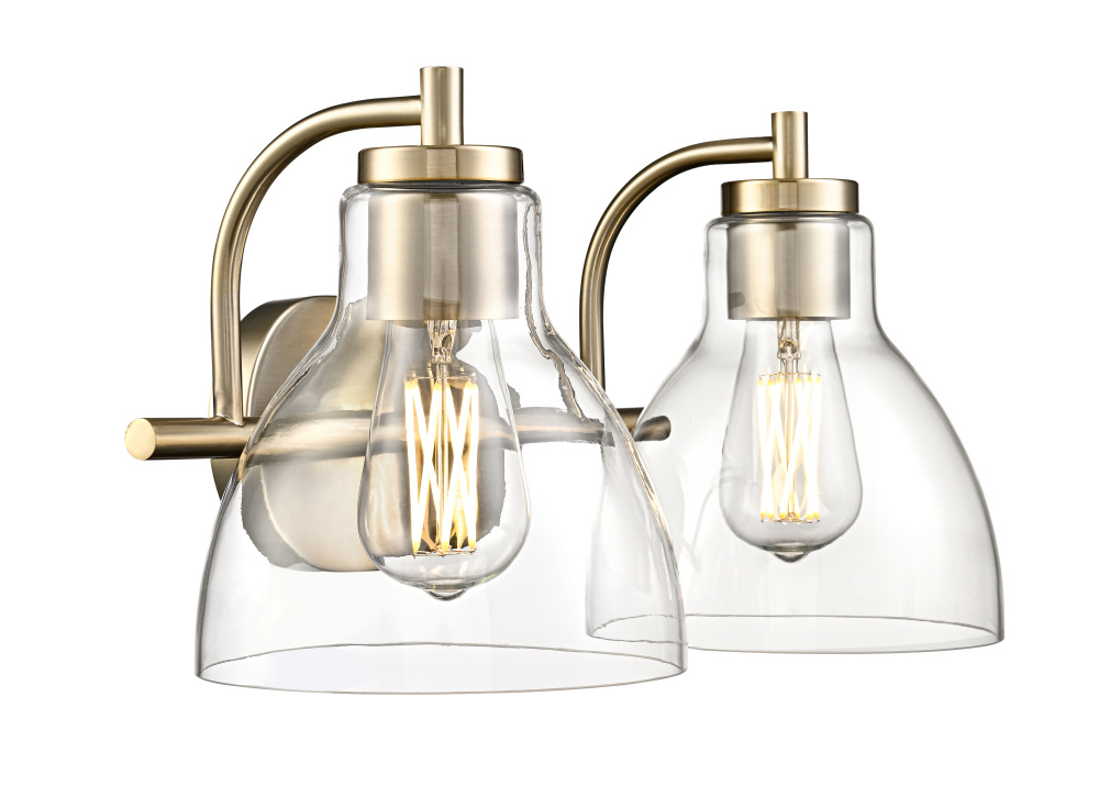 Refined simplicity is the hallmark of the Knightsdale Family of vanity lighting. Graceful bell-shaped clear glass shades set an elegant tone and provide a crisp clear lighting effect perfect for any bath. The minimalistic hardware strikes the perfect balance with the shades and is finished in matte black, chrome, or modern gold. Available as 1, 2 and 3-light options, these fixtures create a sleek and understated profile.