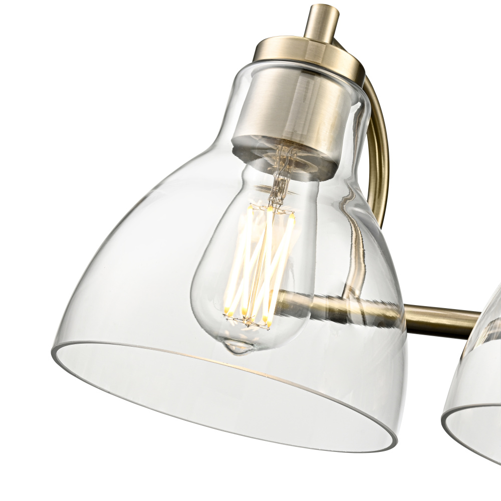 This fixture features a modern gold finish and clear glass shade.