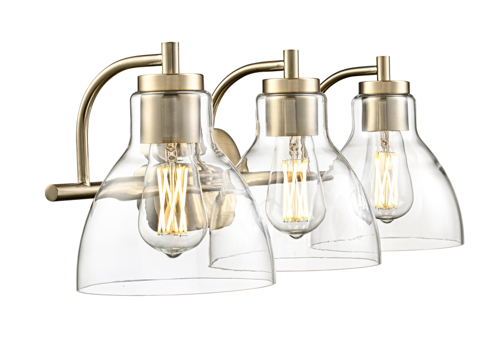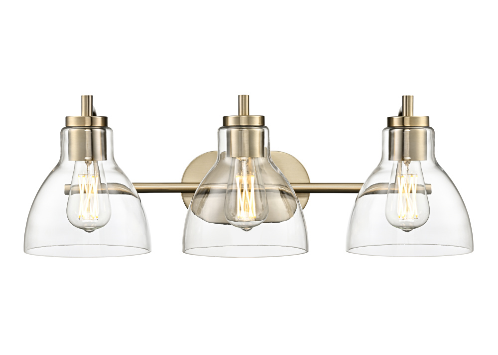 Refined simplicity is the hallmark of the Knightsdale Family of vanity lighting. Graceful bell-shaped clear glass shades set an elegant tone and provide a crisp clear lighting effect perfect for any bath. The minimalistic hardware strikes the perfect balance with the shades and is finished in matte black, chrome, or modern gold. Available as 1, 2 and 3-light options, these fixtures create a sleek and understated profile.