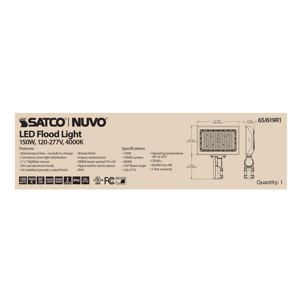 SATCO NUVO's 150 watt flood light adds intrigue to the outdoor architectural landscape. This commercial, LED flood light provides even and consistent light distribution, while offering a wide range of mounting options. Dimmable, with a bronze finish, t