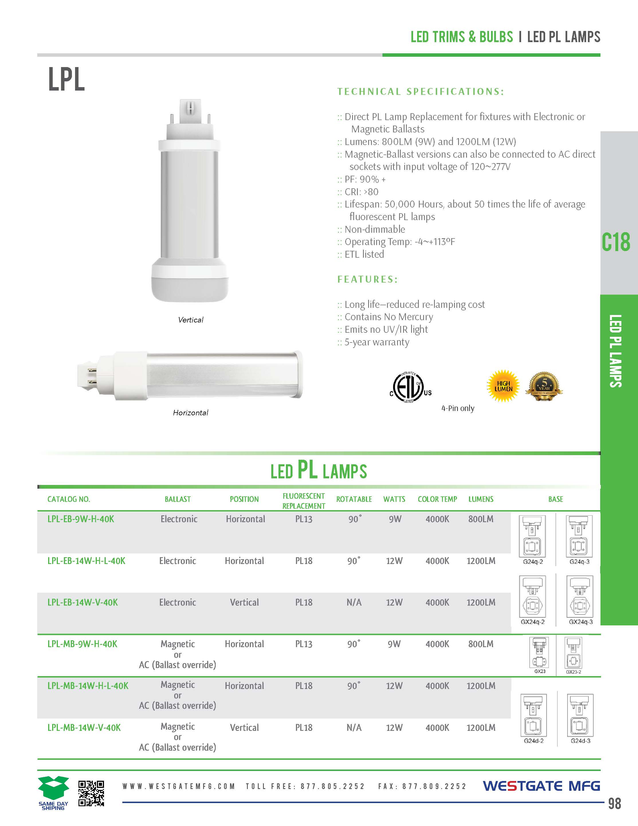 LED PL Lamp, Horiz., 9W, (13W Repl.), G24Q/GX24Q, Electronic Ballast, 800Lm, 80CRI, UL, 4000K