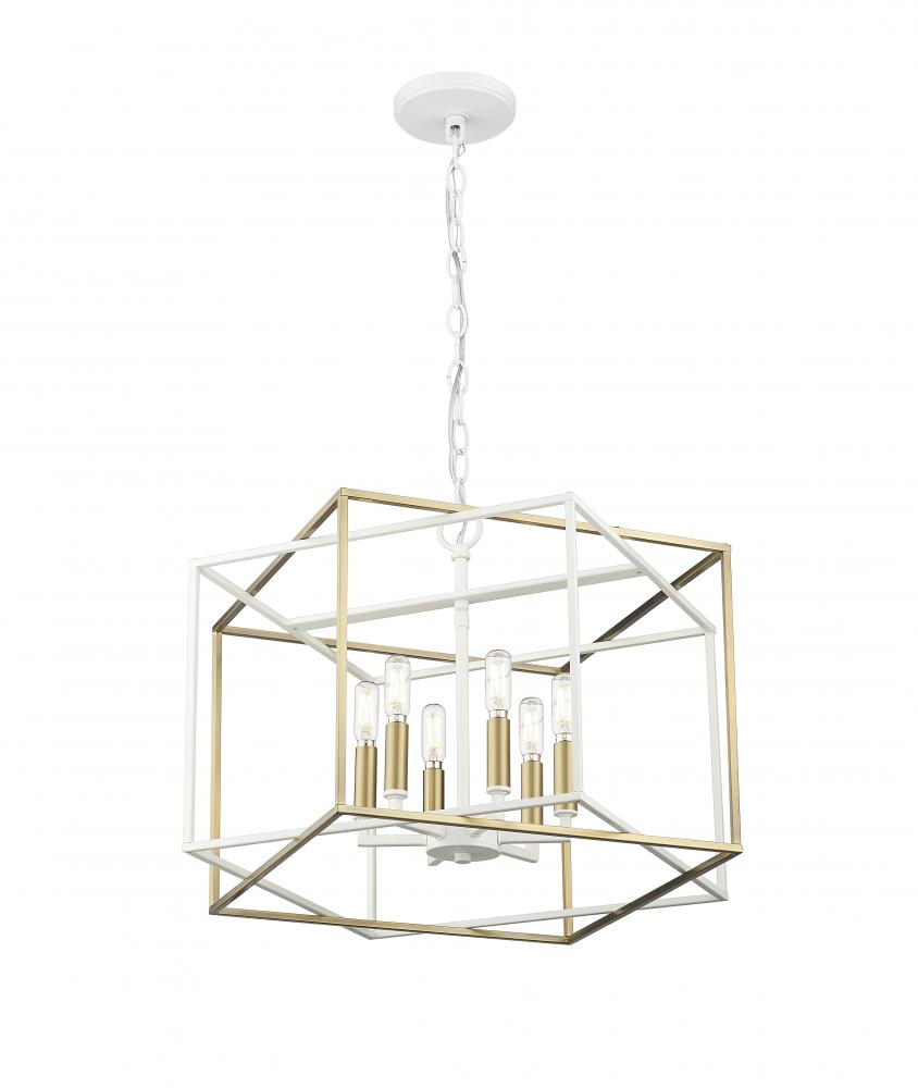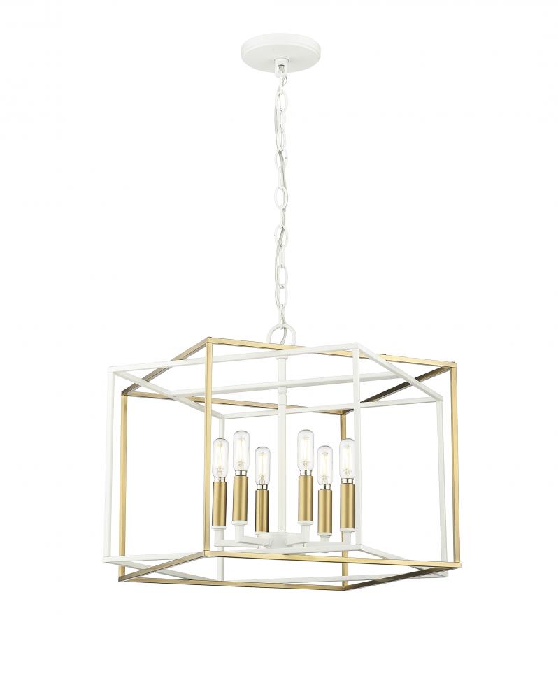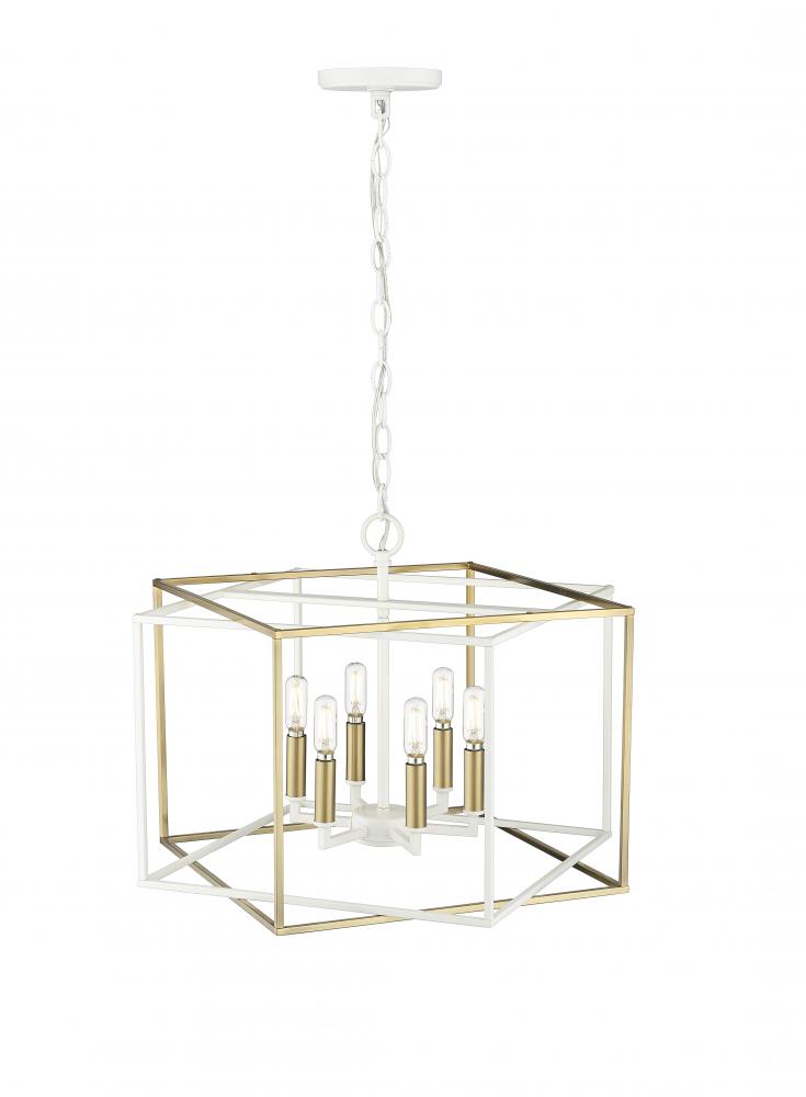 A geometric wonder, the Lowe Family of pendant lighting features an angular interlocking structure framing either 6 or 8 lights. The overall effect is reminiscent of Mondrian mobiles, creating a delicate balance of lines and movement. Finished in a contrasting blend of matte white and vintage brass, these sleek fixtures are designed to make a bold and exciting statement above any dining table or kitchen island.