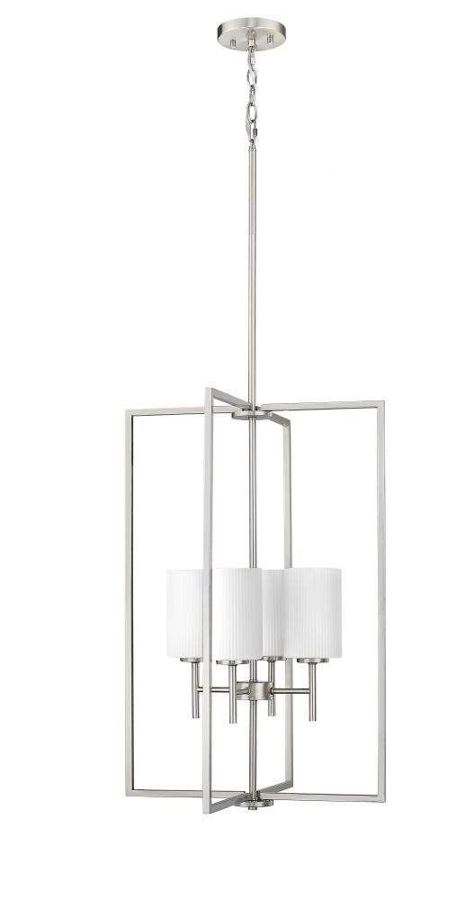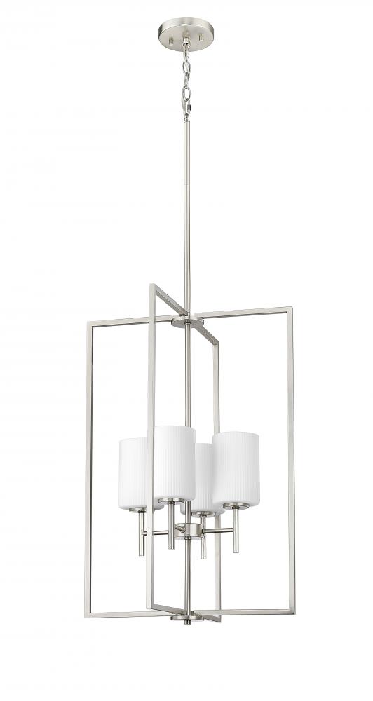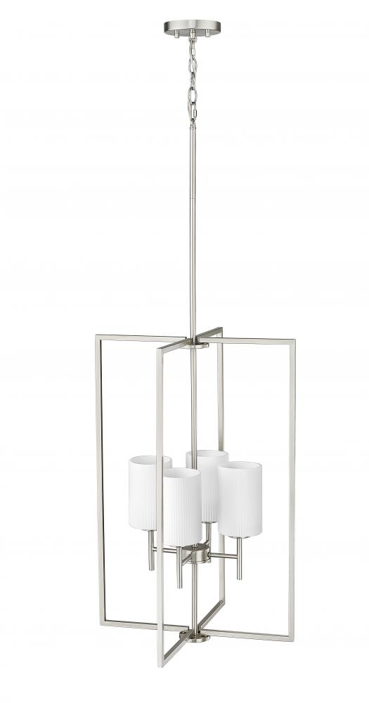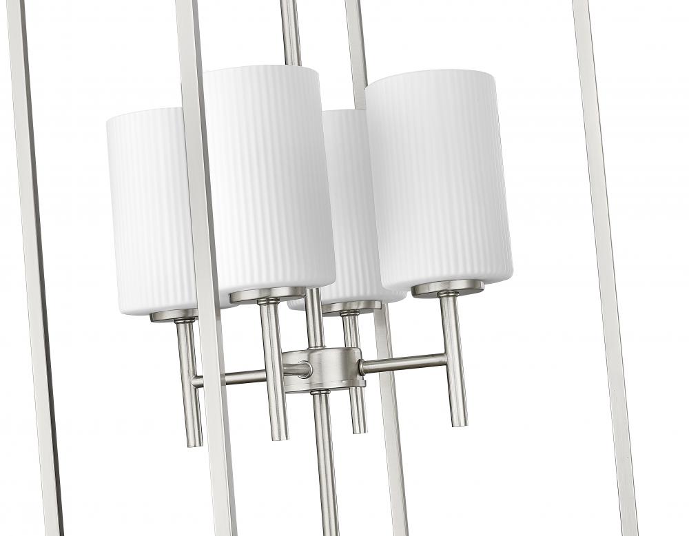 A true statement piece for any kitchen or entryway, the Luxx family of pendant lighting incorporates angular lines to provide a dramatic framework for the 4-lights and the ribbed etched, opal white glass globes. Available in either matte black or brushed nickel, the profile evokes a dramatic and contemporary homage to classic suspended-style lanterns.