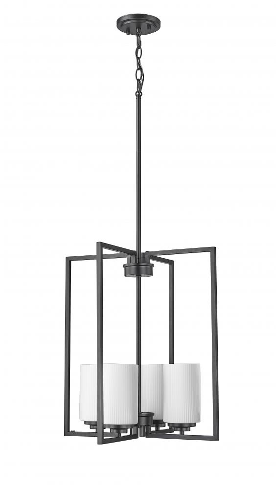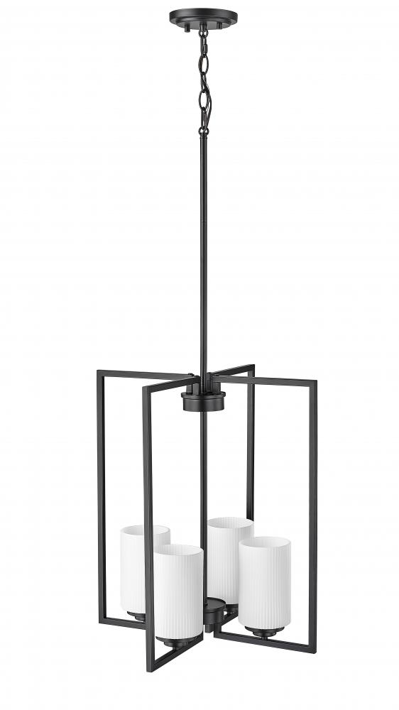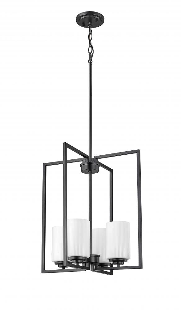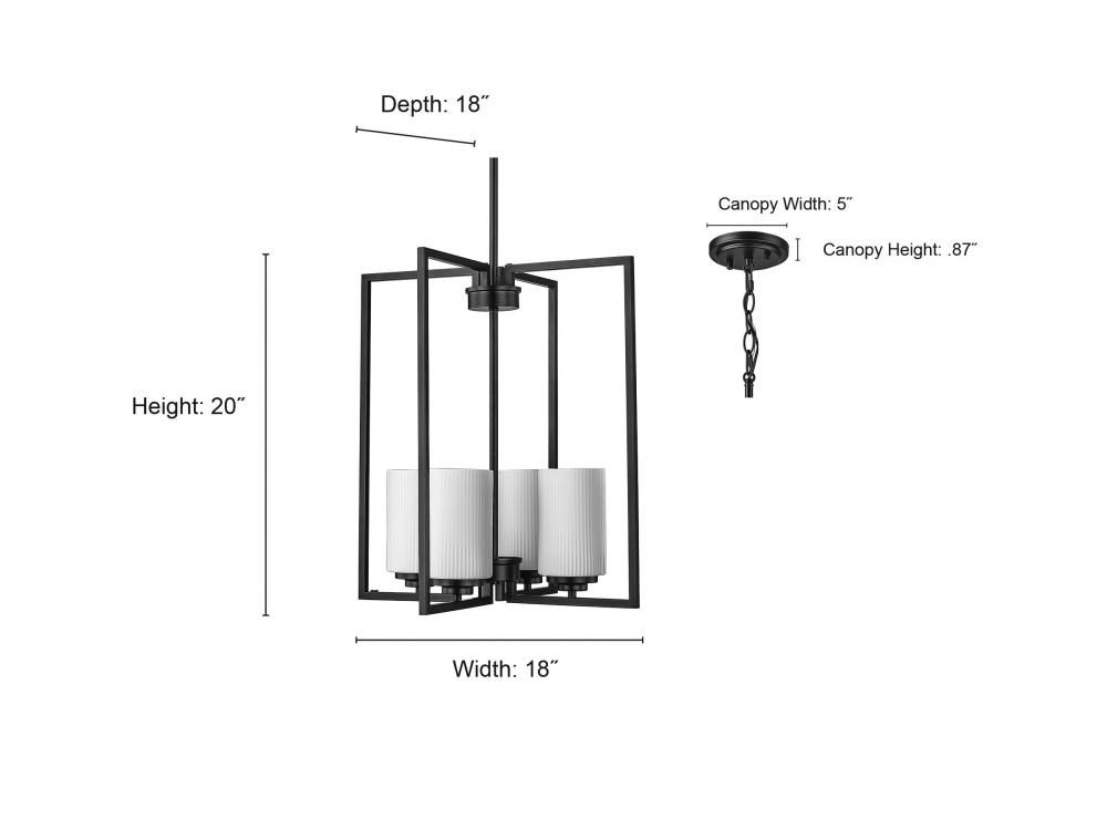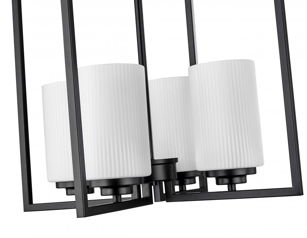 A true statement piece for any kitchen or entryway, the Luxx family of pendant lighting incorporates angular lines to provide a dramatic framework for the 4-lights and the ribbed etched, opal white glass globes. Available in either matte black or brushed nickel, the profile evokes a dramatic and contemporary homage to classic suspended-style lanterns.
