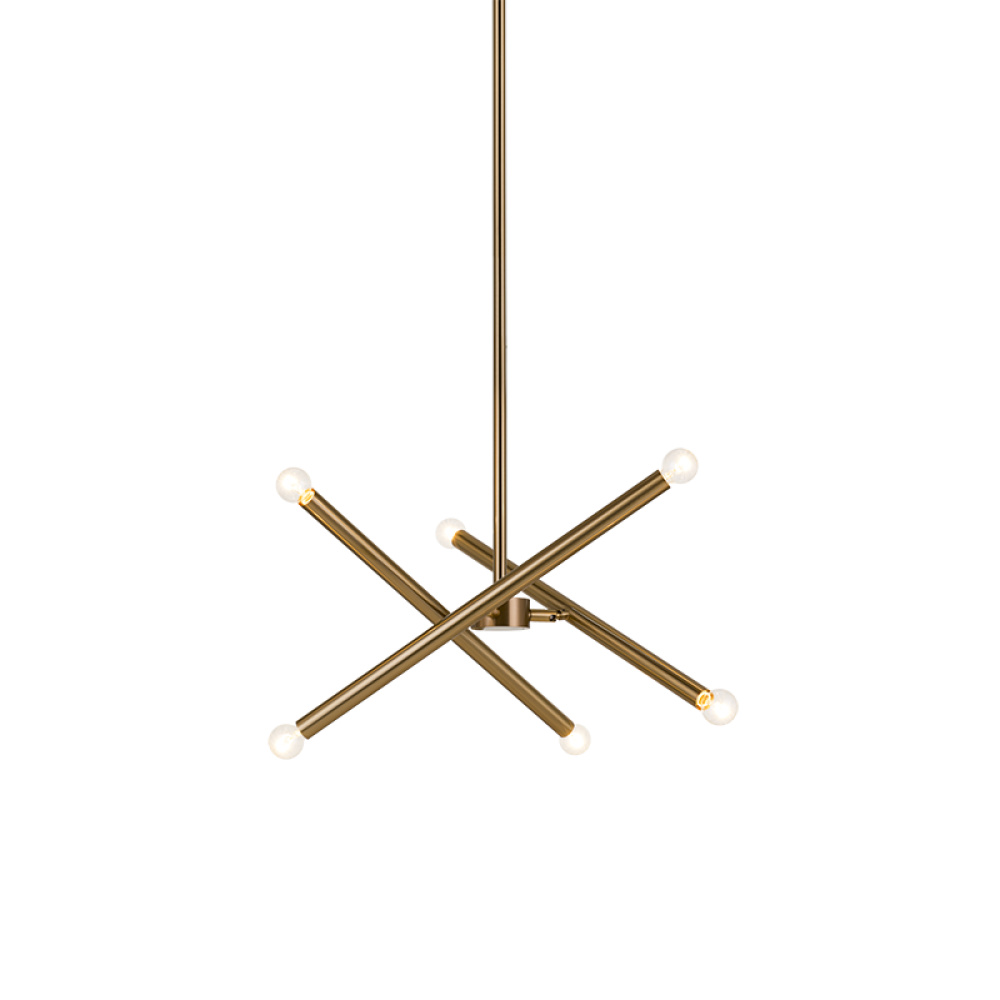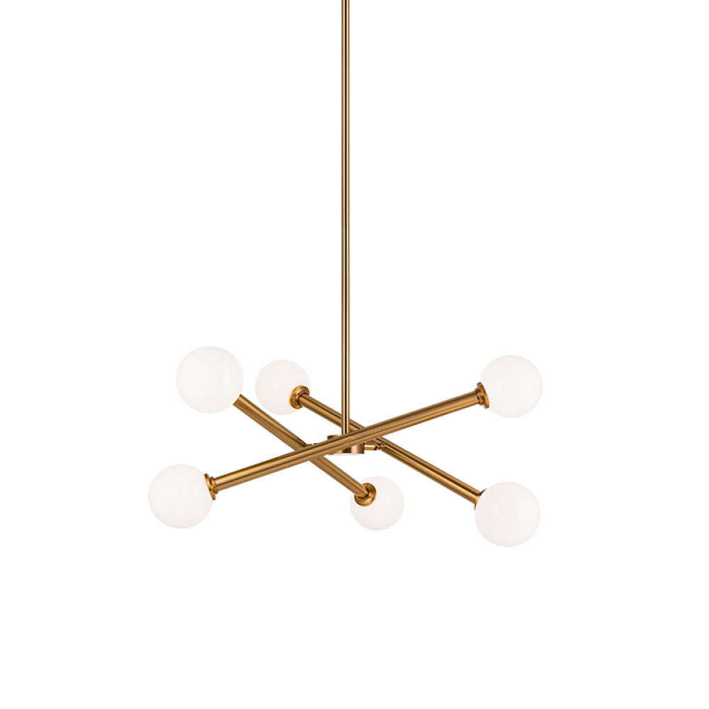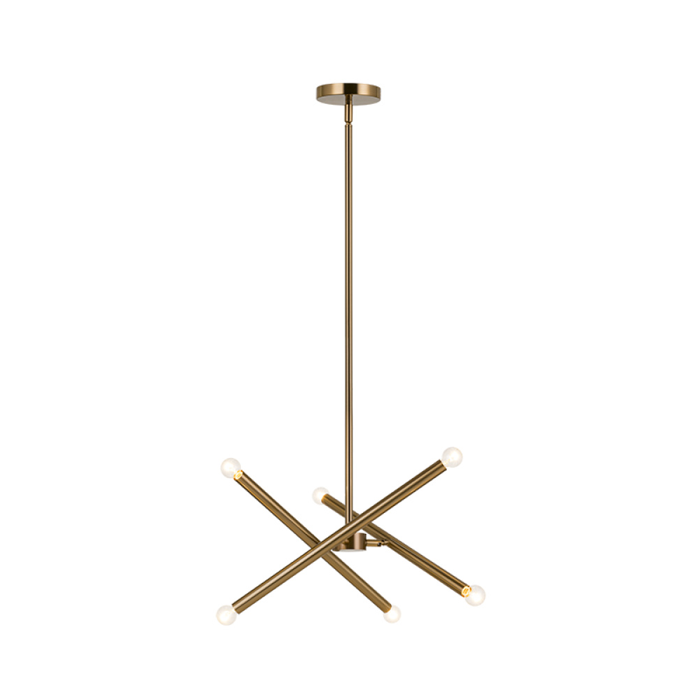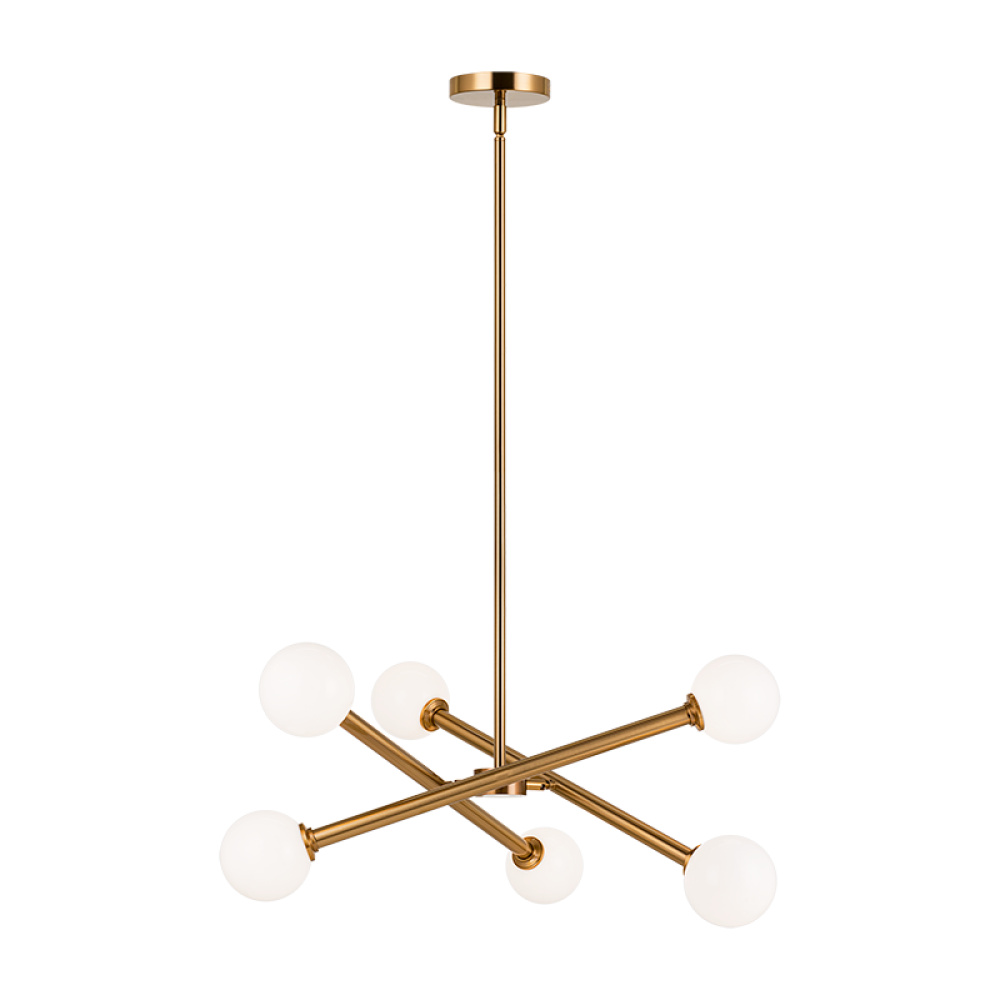 Matchstix chandelier will be a dramatic addition to any room. Modern movement in the crossing bar design will be a signature piece. Available in Aged Gold Brass or Black with either Clear or Opal glass.