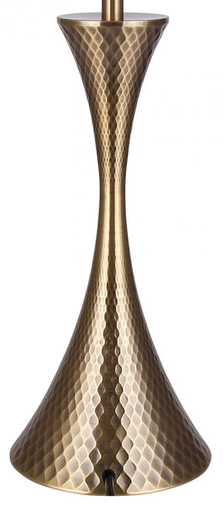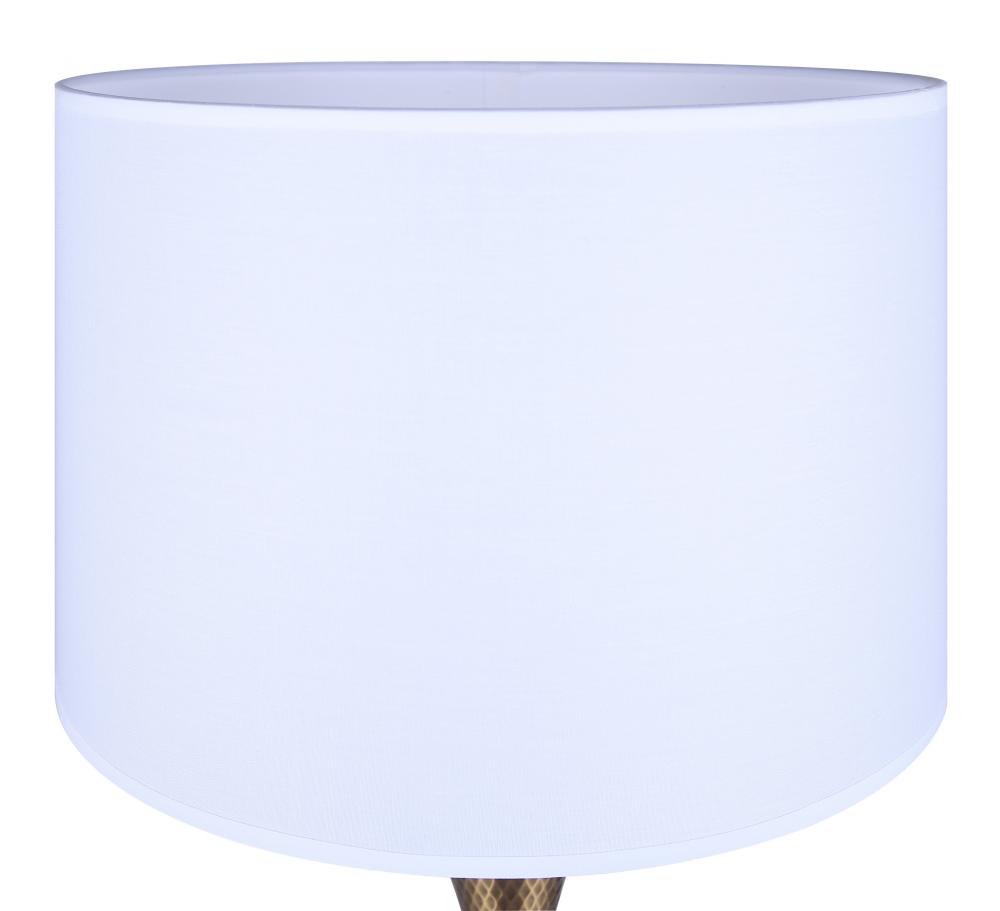 Elevate your interior with our stunning mid-century modern table lamp, featuring a hammered gold base and a chic white fabric shade. This decor lamp exudes sophistication, making it perfect for reading nooks, living room side tables, and bedrooms. Standing at 13.75 inches wide and 25.75 inches high, it offers a striking yet elegant presence in any space. Equipped with a 100W Type A bulb (not included) and a 3-way socket switch, it provides versatile lighting options to suit your needs. The clear cord ensures a seamless look, enhancing the lamp's contemporary charm while adding practical functionality to your home decor.