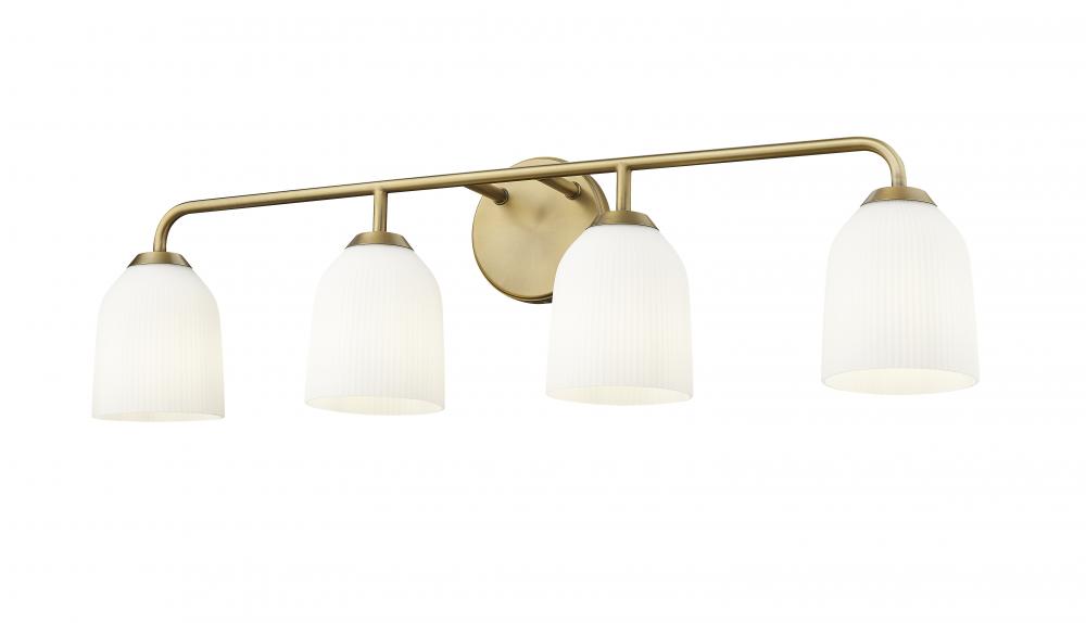 Inspired by the functionality and simplicity of the Craftsman design movement, the Norah Family of vanity lighting creates a radiant addition to any bath while eliminating shadows. ?These 2-, 3-, and 4-light fixtures comprise bell-shaped, ribbed, opal glass globes perfectly balanced with understated and gently curved lines. The collection is finished in either matte black, brushed nickel, or vintage brass.
