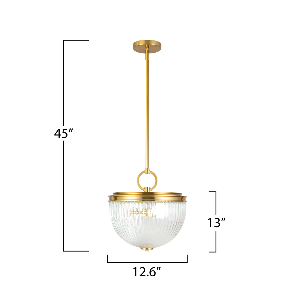 The Myla Collection pendant by Kevin Kraemer is a captivating blend of vintage charm and refined elegance, featuring a radiant brass frame that beautifully complements its clear ribbed glassware. The timeless design creates a warm and inviting glow, making it a stunning centerpiece in any setting. Perfectly crafted for those who appreciate classic sophistication with a modern touch. (this model can be used as a rod pendant or a semi-flushmount fixture)