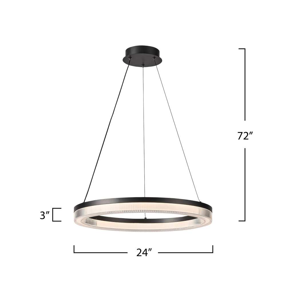 Elevate your space with the modern elegance of the LED chandelier from the Ari Collection. Its sleek black frame and ribbed clear bottom lens create a soft, mesmerizing glow. Suspended by adjustable aircraft type cables with a "push-pin" system, it offers both style and effortless versatility. This model has a 3CCT switch to choose the color temperature of your preference (3K, 4K, 5K).