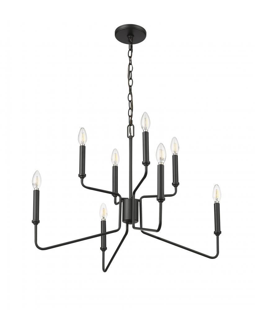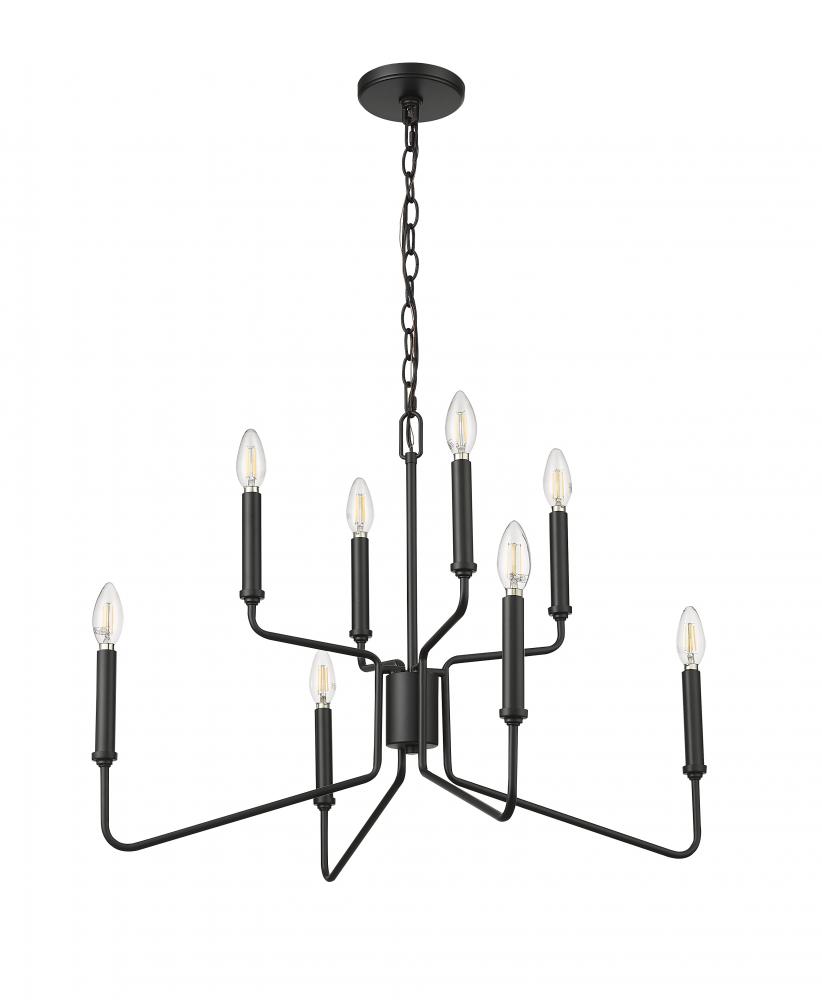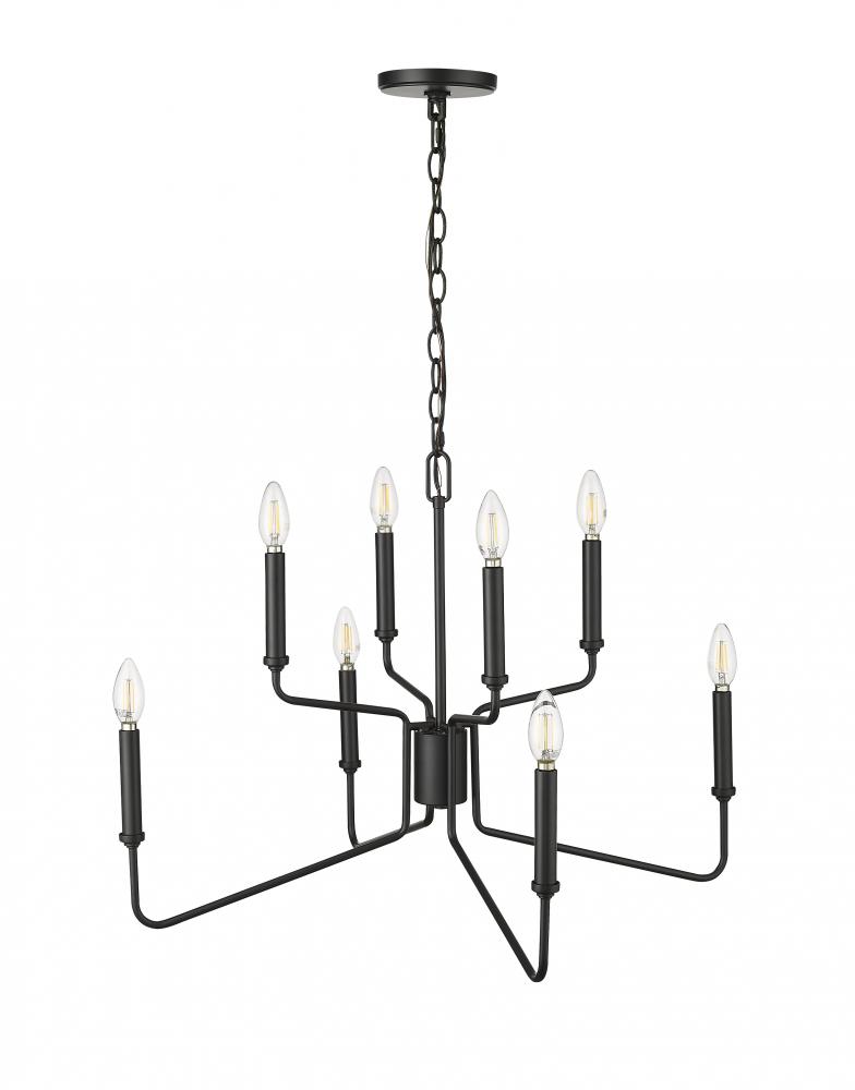 The Raven Collection is a minimalist delight designed to make a striking statement. The angled, offset arms tier upwards with sleek simplicity, creating a soaring abundance of light, perfect for any dining or gathering area. Finished in either matte black or polished nickel, this collection of chandeliers is available in both 8-light and 1 options.