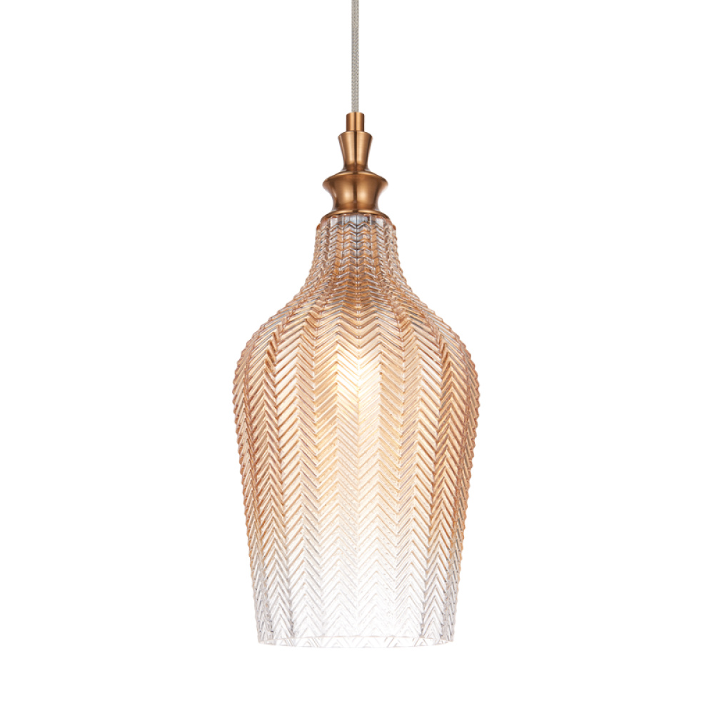 The Renity series features an elegant design of chevron textured glass, matched with either Aged Gold Brass or Smoke finish.These sophisticated pendants will add charm to any space. Available in 2 glass shapes.