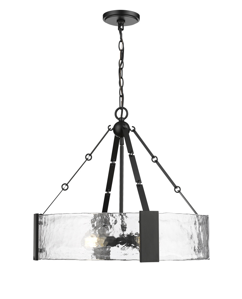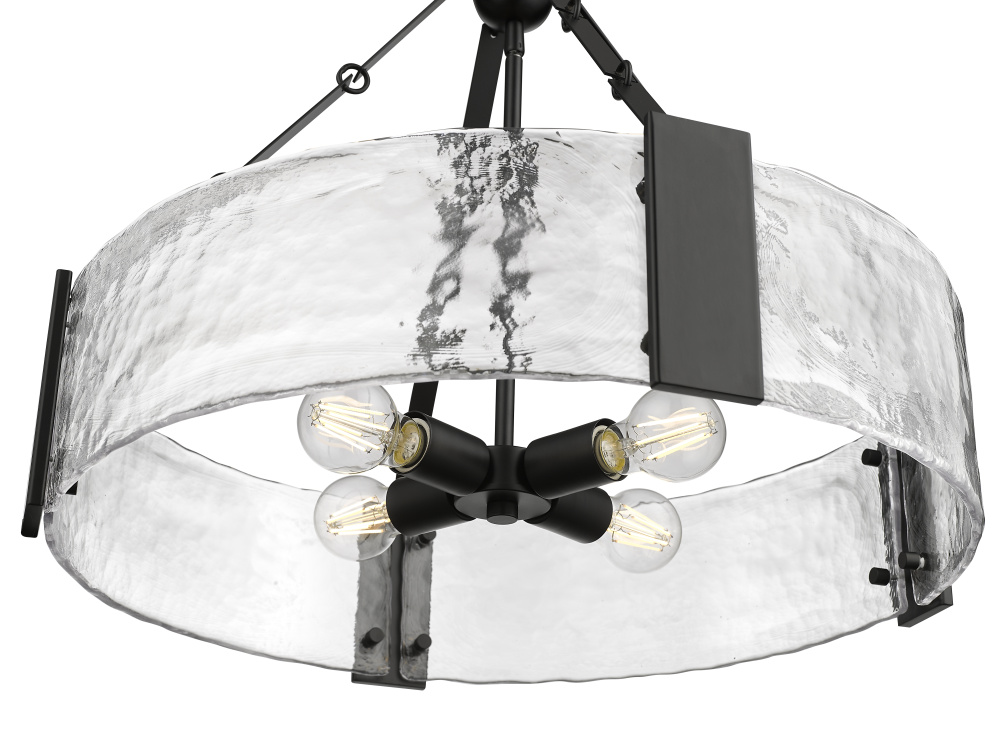 Clear hammered glass panels are the sparking stars of the Rezi Family. Featuring modern hardware supporting an understated minimalist framework, these fixtures are finished in matte black and are available as 1-light sconce and 3- or 4-light chandeliers. The stunning textured glass creates a glistening lighting effect for subtle and diffused illumination. Meticulously crafted, these fixtures are naturally inspired works of art that will enhance any interior space from entryway to dining room.