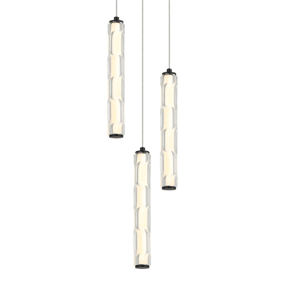 This family features a sleek, modern design with a vertically oriented, elongated cylindrical glass shade that has a wavy, textured surface. The inner 5CCT LED light diffuses through the contoured glass, giving off a soft glow that plays beautifully with the curves adding visual interest and depth. Comes in Aged Gold Brass and Matte Black.