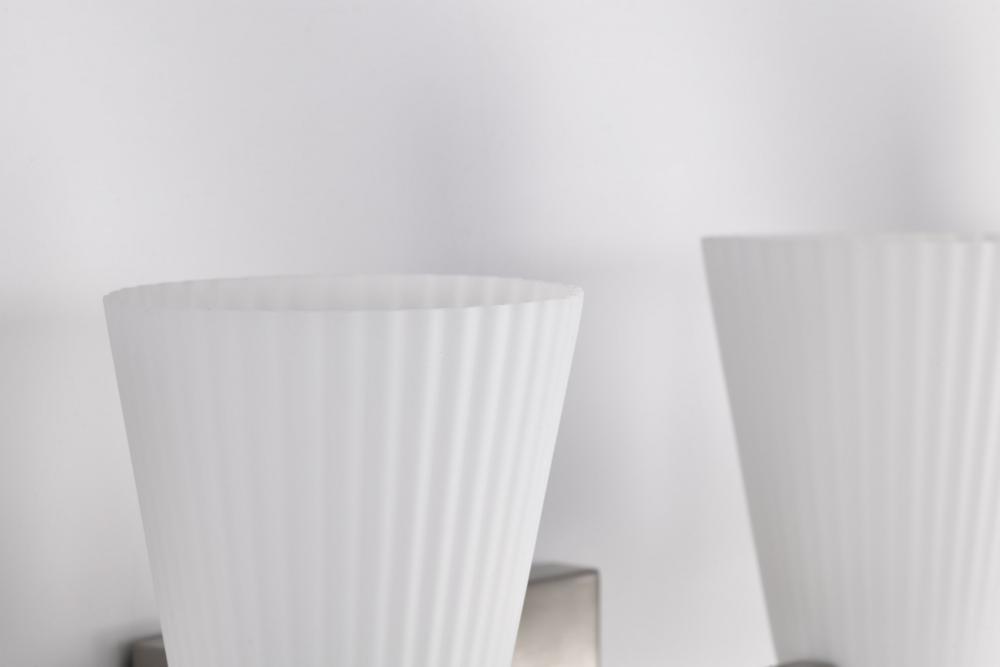 Indulge in the glamour of the Royale Collection, where sleek Art Deco silhouettes meet modern refinement. The satin white pleated glass adds texture and sophistication, diffusing light with a soft, radiant glow. Available in brushed nickel and burnished br