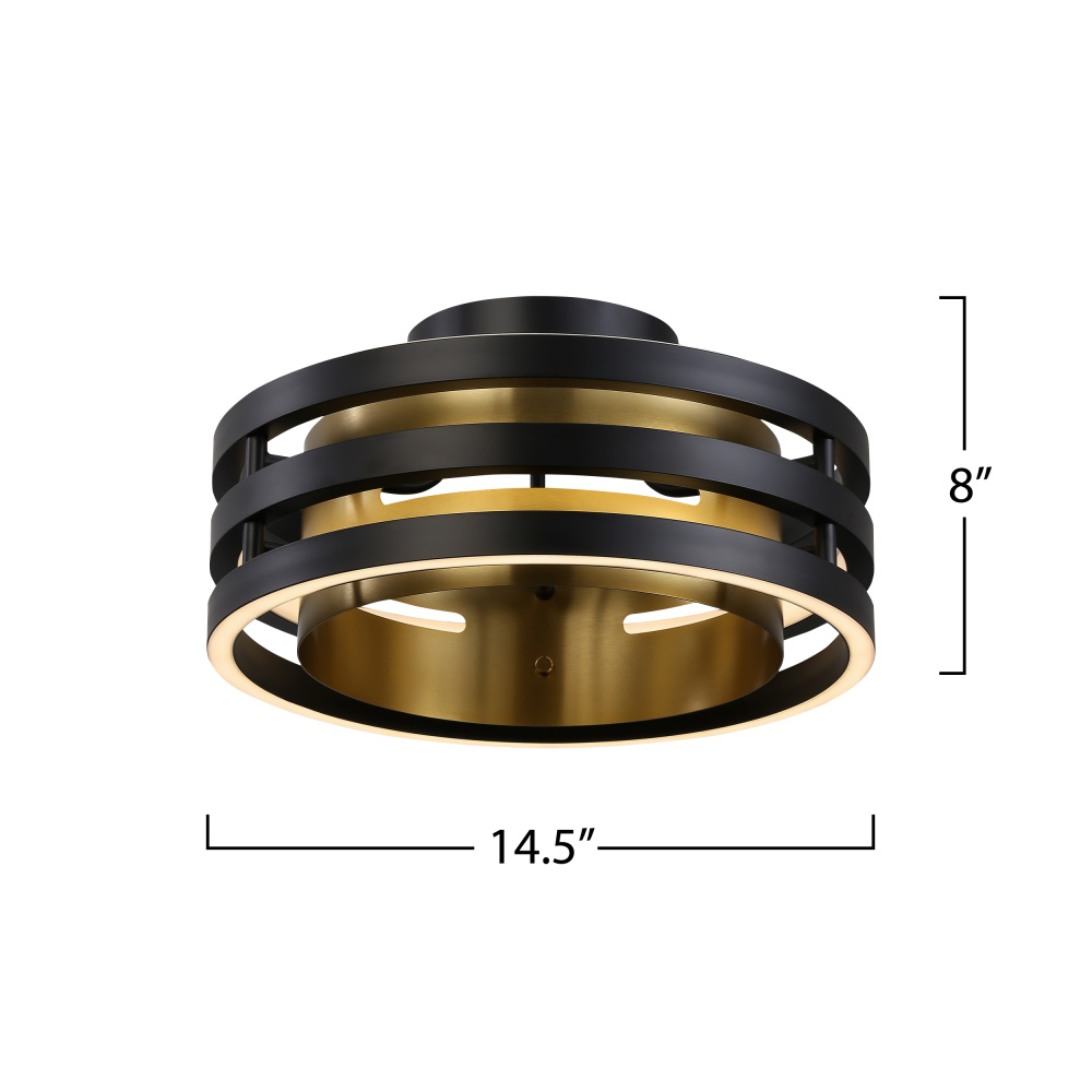 The Toledo collection by designer Kevin Kraemer boasts a striking 3-ring architecture. The outer ring is elegantly finished in black, and the inner is adorned in a lustrous brushed brass. This exquisite combination of contrasting colors creates a visually captivating chandeliers. Illuminated by energy-efficient LED - the bottom, middle, and top rings illuminate. This model has a switch to change the color temperature from 2700, 3500 and 4500 kelvin. Semi flushmount shown. (matching chandelier available)