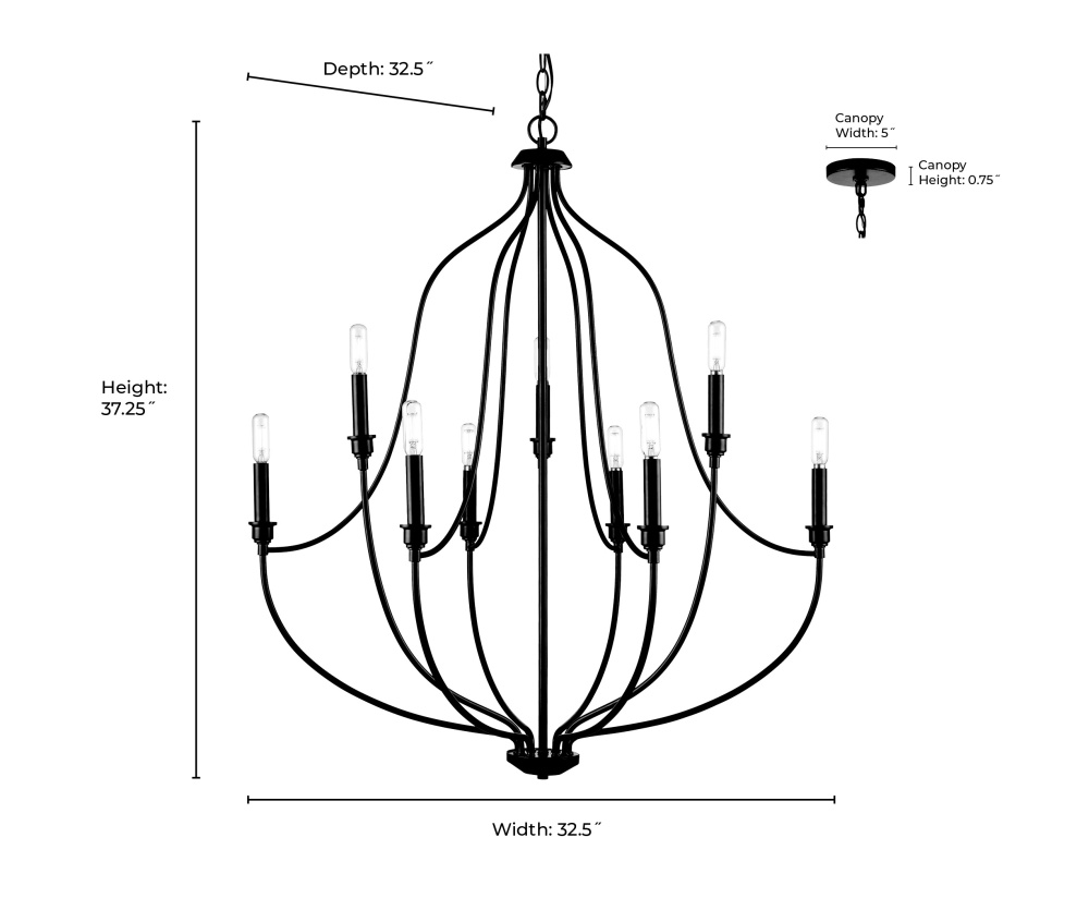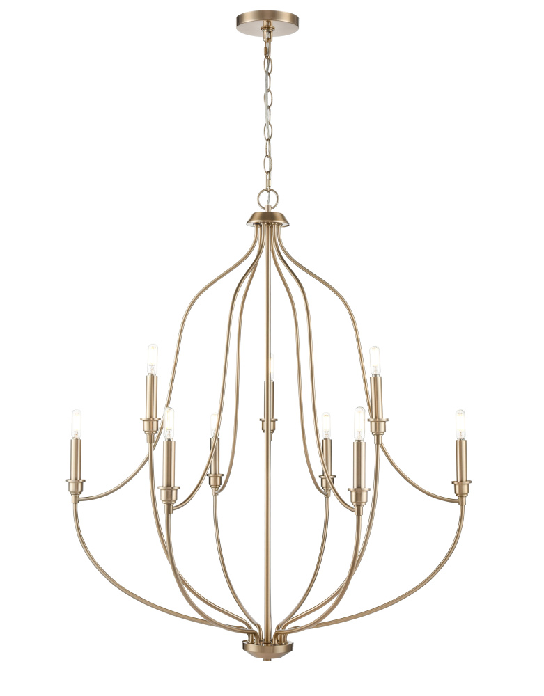 The Senoia Collection of chandeliers is a delightful interpretation of wrought iron inspired French country lighting design. Accentuated with draping lines evocative of delicate scrollwork and perfectly placed candles with cups, the collection is finished in matte black or modern gold and is available as 5-light or 9-light options. The result is a light, airy profile perfect for any interior. from modern transition to classic farmhouse.