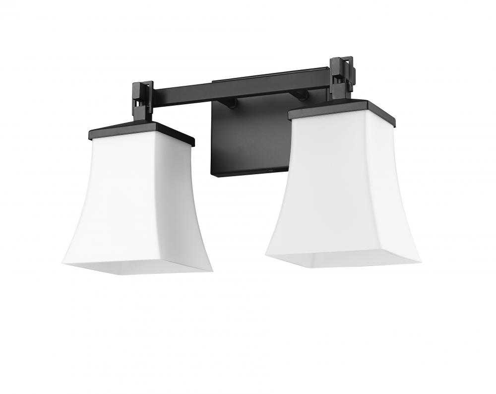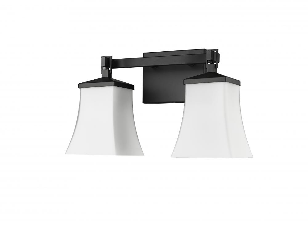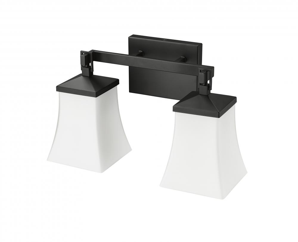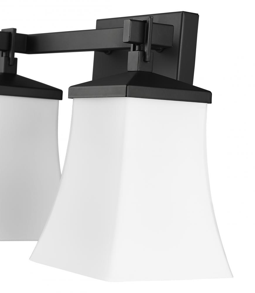 The Sonorra Family of vanity lighting combines modern styling with classic Arts and Crafts movement design details. Perfect for interiors from Asian inspired to ultra-modern, the square, white frosted glass globes are enhanced by stylish hooks and clean, angular lines of the fixture. These 1-light, 2-light, and 3-light vanity lamps are in matte black.