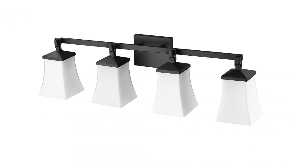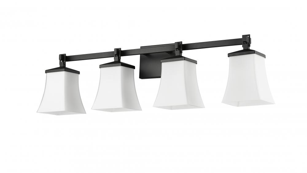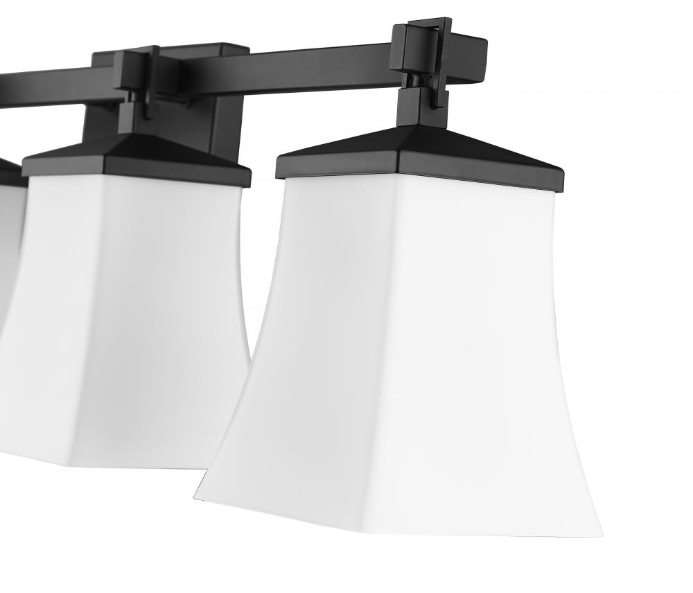 The Sonorra Family of vanity lighting combines modern styling with classic Arts and Crafts movement design details. Perfect for interiors from Asian inspired to ultra-modern, the square, white frosted glass globes are enhanced by stylish hooks and clean, angular lines of the fixture. These 1-light, 2-light, and 3-light vanity lamps are in matte black.
