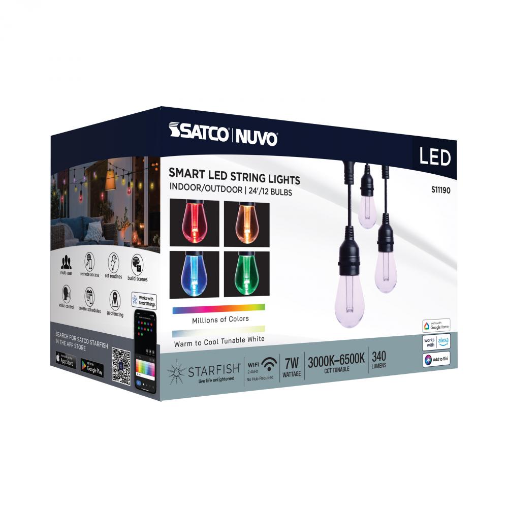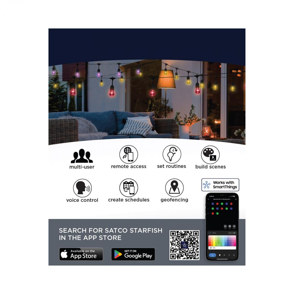 SATCO's STARFISH Smart LED String Lights deliver virtually unlimited color selections and control with the STARFISH app. Easily install with the integrated hanging hooks, connect to the app, and tailor the ambiance of your patio, dining area, or party