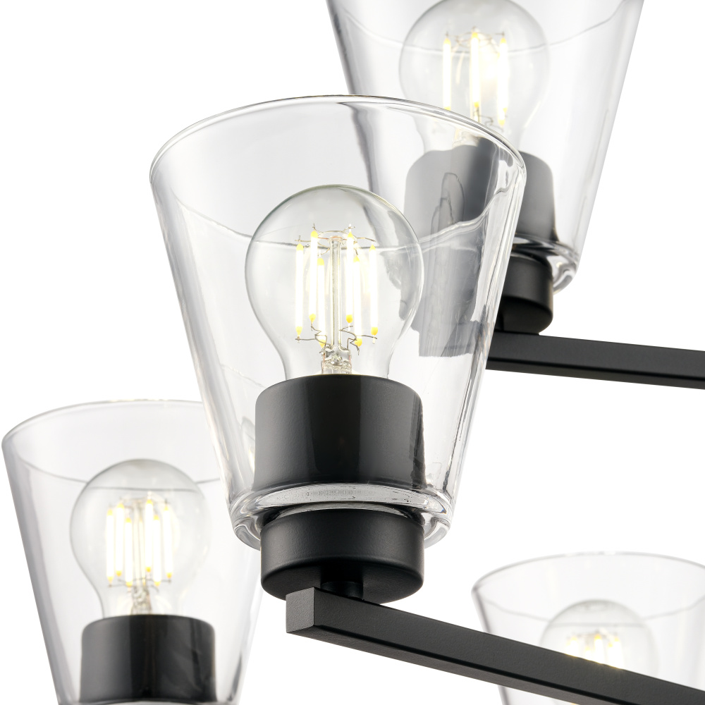 Perfectly flared crystal-clear glass shades framed against streamlined fixtures set a unique design tone for the Strayhan Family of interior lighting. Perfect for illuminating any location from the entryway on throughout the entire home, these fixtures are available as a 1-light sconce, 1-light pendant, 2-light flushmount; 1, 2, 3 and 4-light vanity; and 3, 5, and 9-light chandelier. Finished in matte black, brushed nickel, or modern gold, these understated fixtures infuse a cosmopolitan design sense into any interior space.