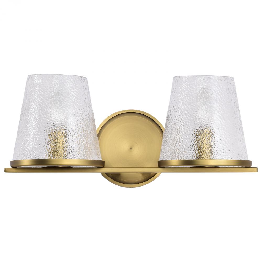 Valentine; 2 Light Vanity; Vintage Brass Finish; Hammered Glass