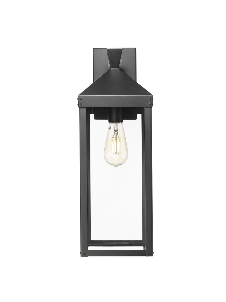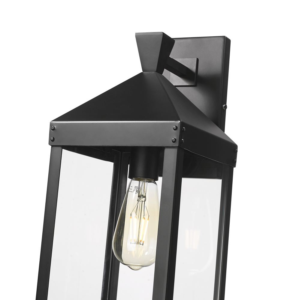 The Yates Family of exterior lighting is distinguished by its elongated profile and minimal framework. Oversized clear glass panels provide optimum illumination, and the angled lines of stylized cover and finial complete the contemporary look. Finished in durable powder coat black, these fixtures are available as 1- or 3-light sconces and are the perfect statement piece for any modern exterior front porch, walkway, or loggia.